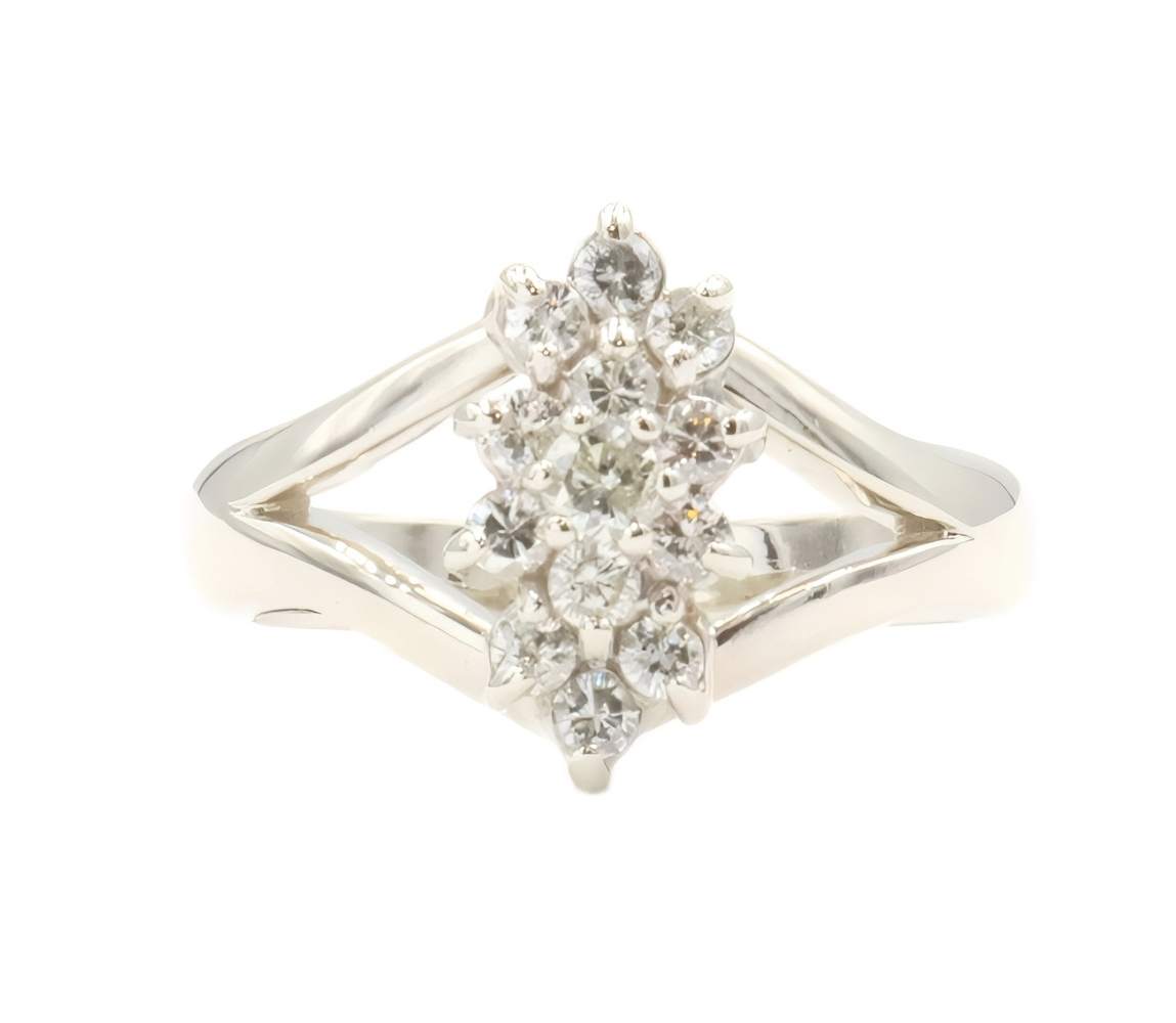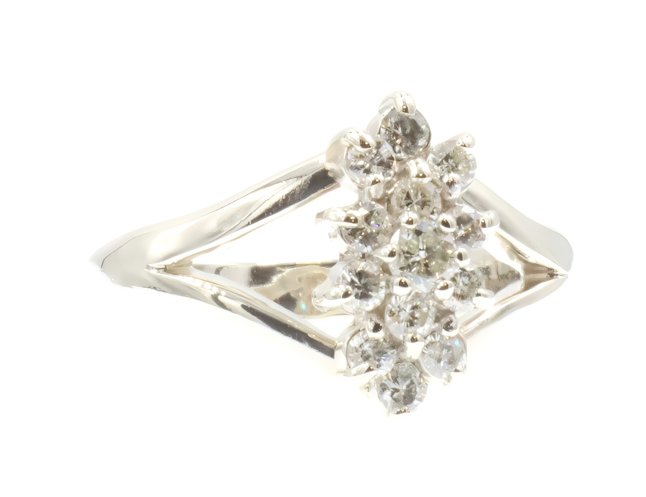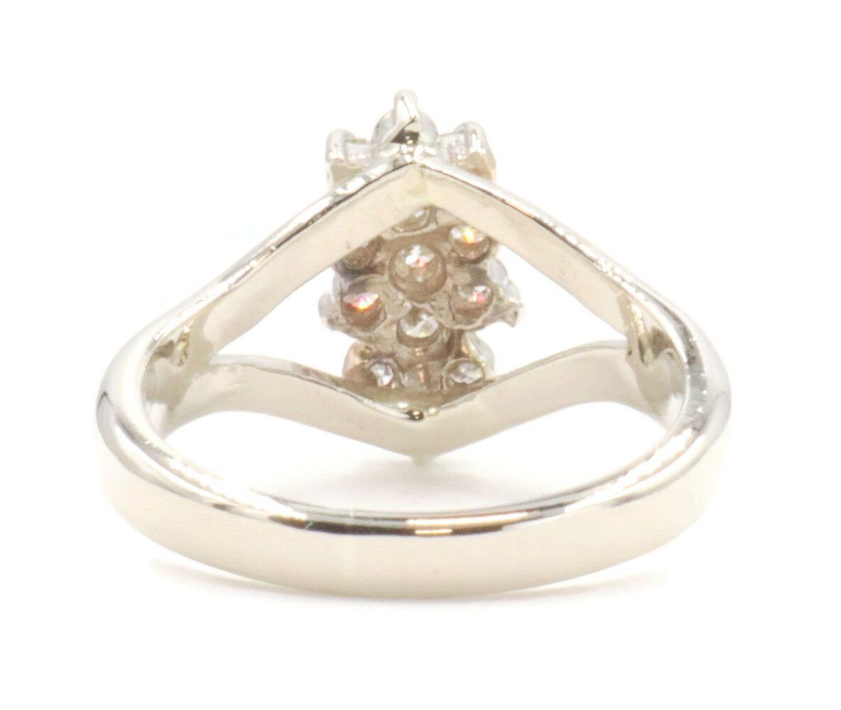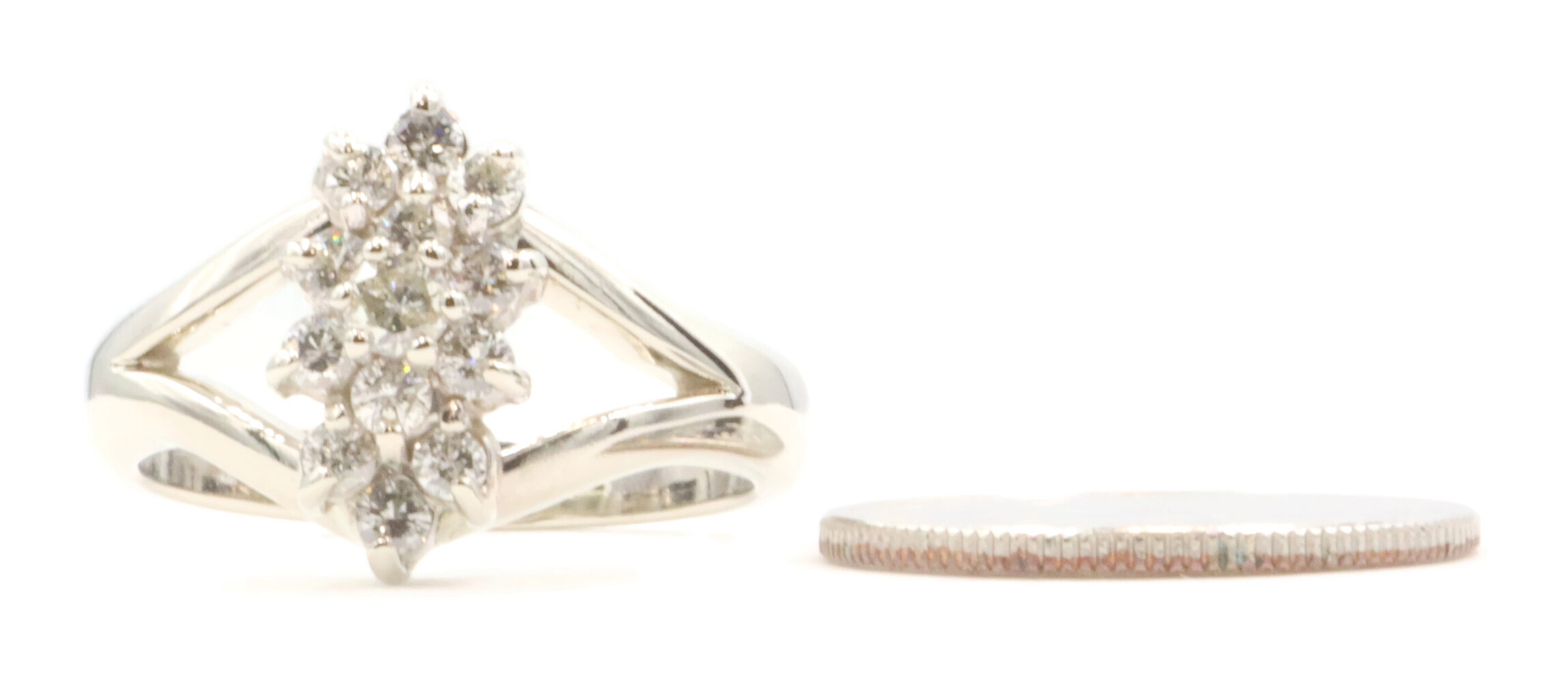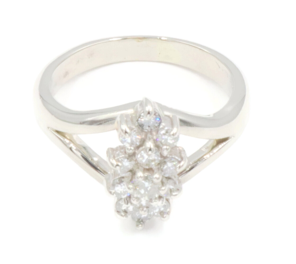 Women's 0.36 Ctw Round Cut Diamond Cluster 14KT White Gold Split Shank Ring 4.7g. This ring is a size 6 3/4.