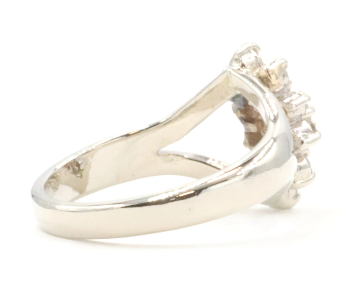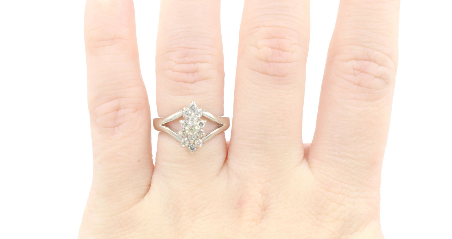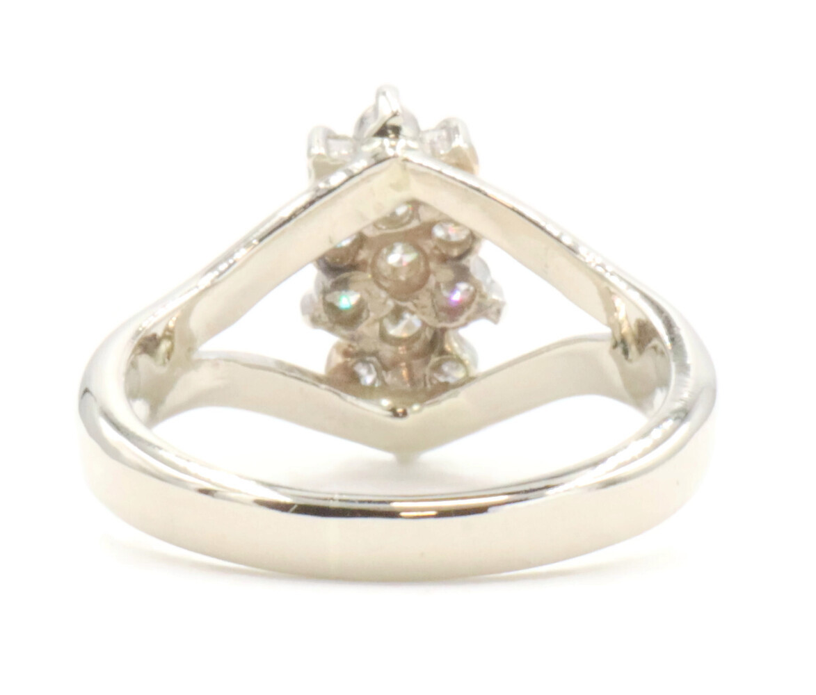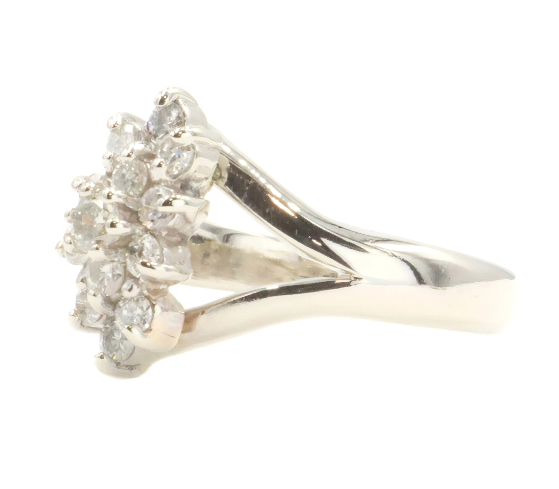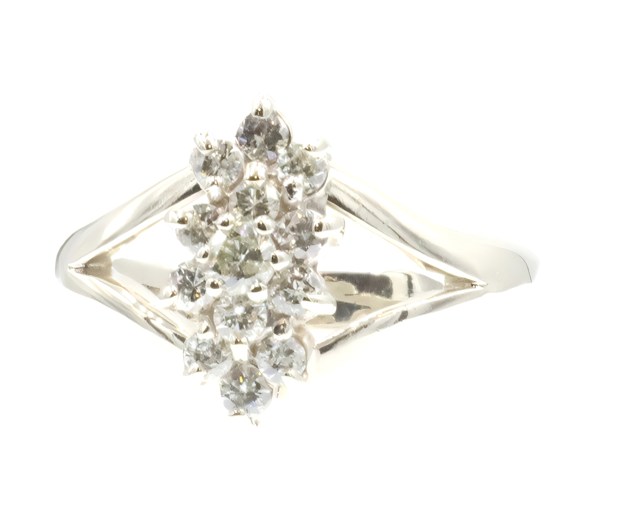 Women's 0.36 Ctw Round Cut Diamond Cluster 14KT White Gold Split Shank Ring 4.7g. This ring is a size 6 3/4.