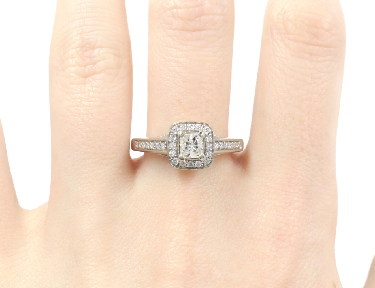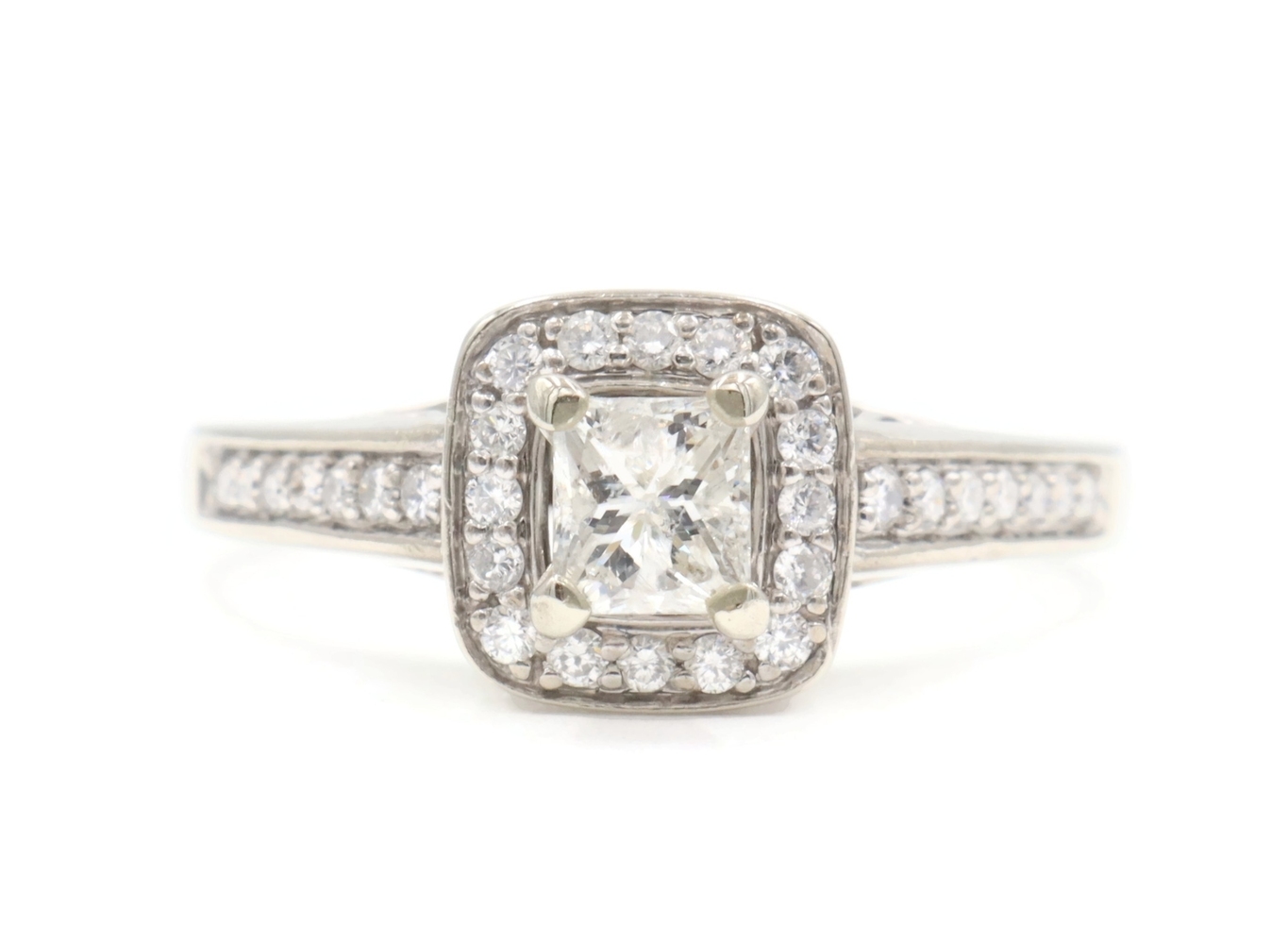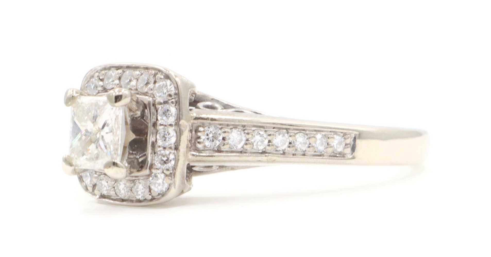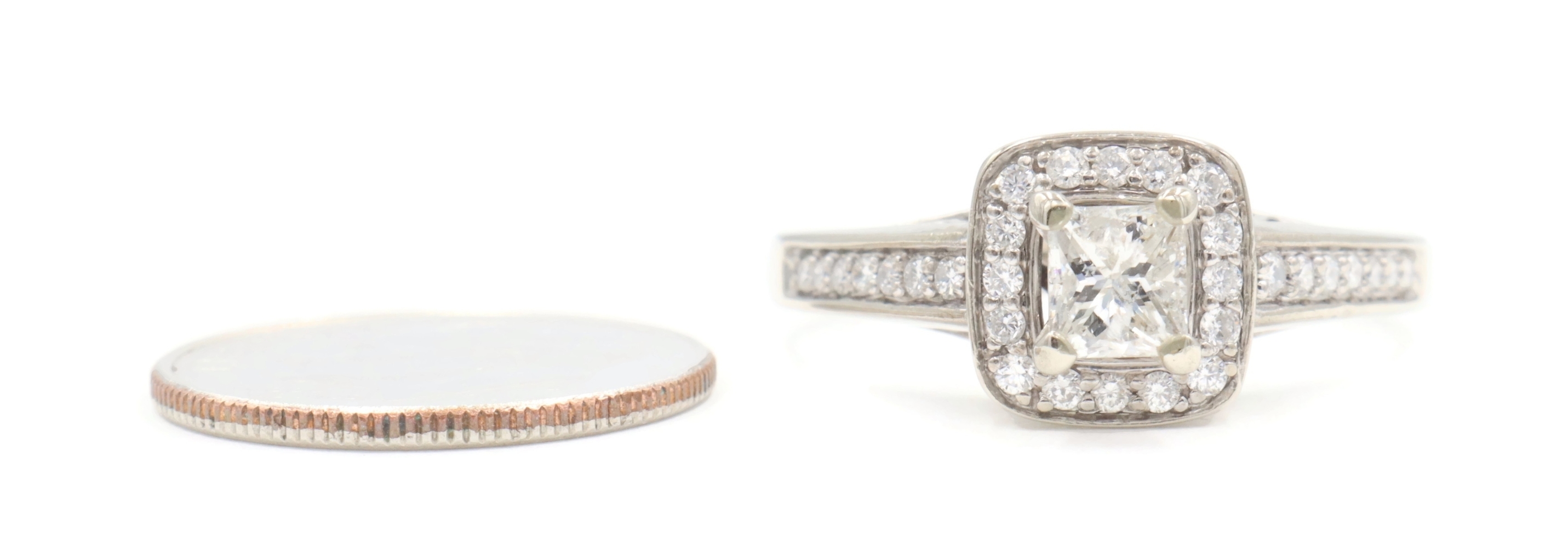 Women's 0.80 Ctw Princess & Round Diamond 14KT White Gold Square Halo Ring 4.68g. This ring is a size 8 3/4.