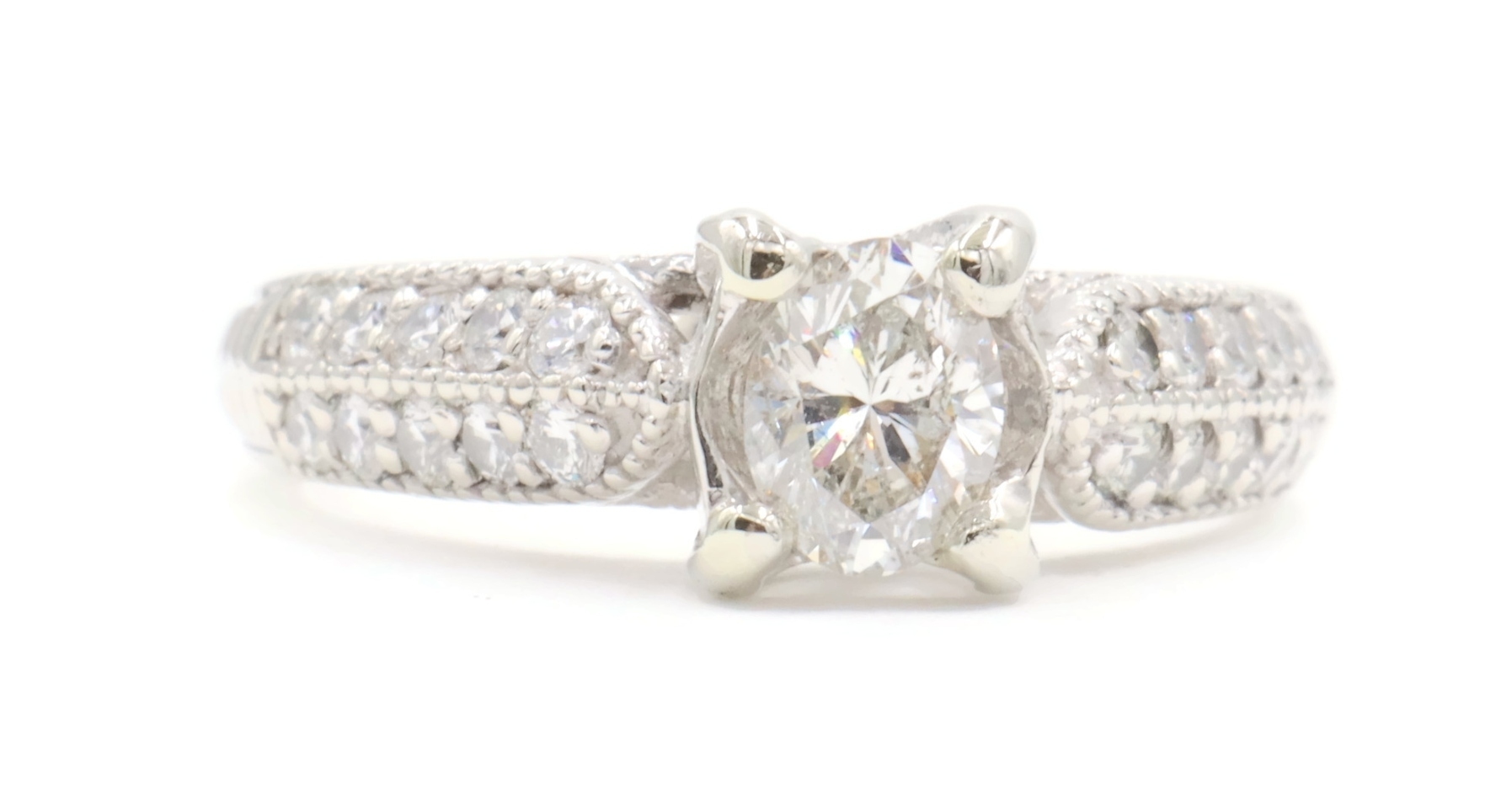 Women's 1.02 Ctw Oval & Round Diamond 14KT White Gold Milgrain Engagement Ring. This ring is a size 6 1/4.