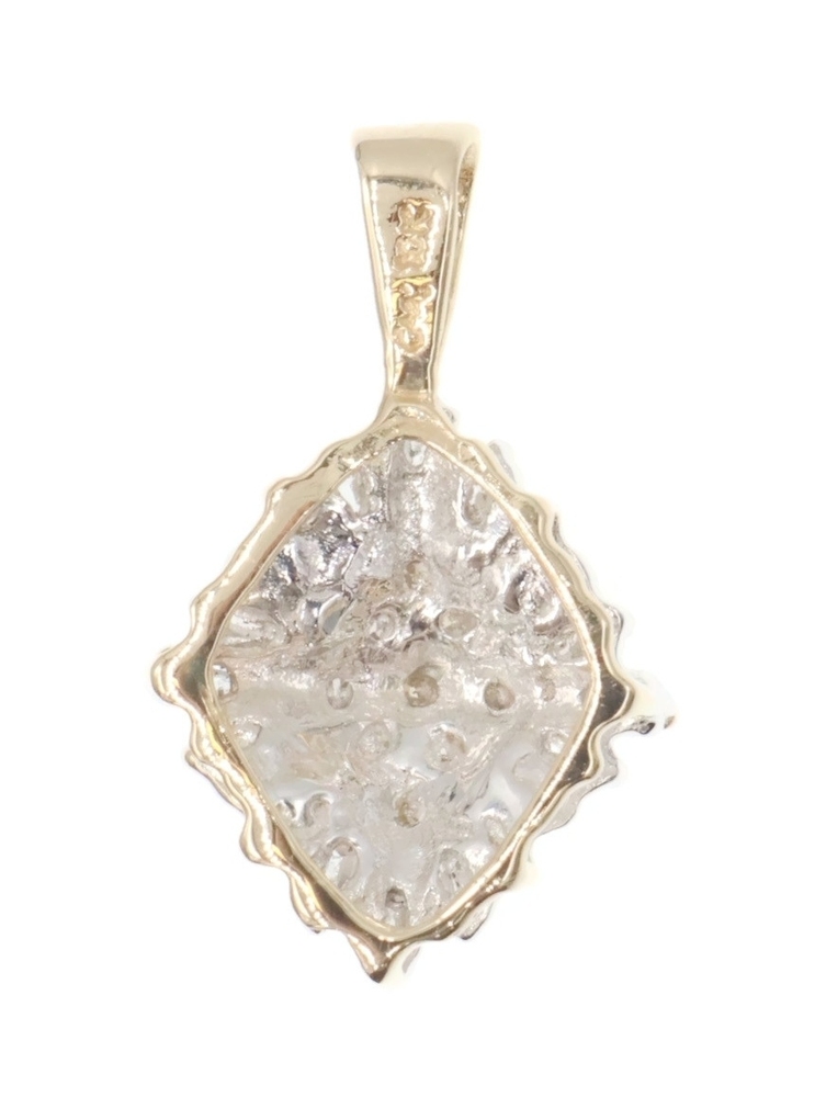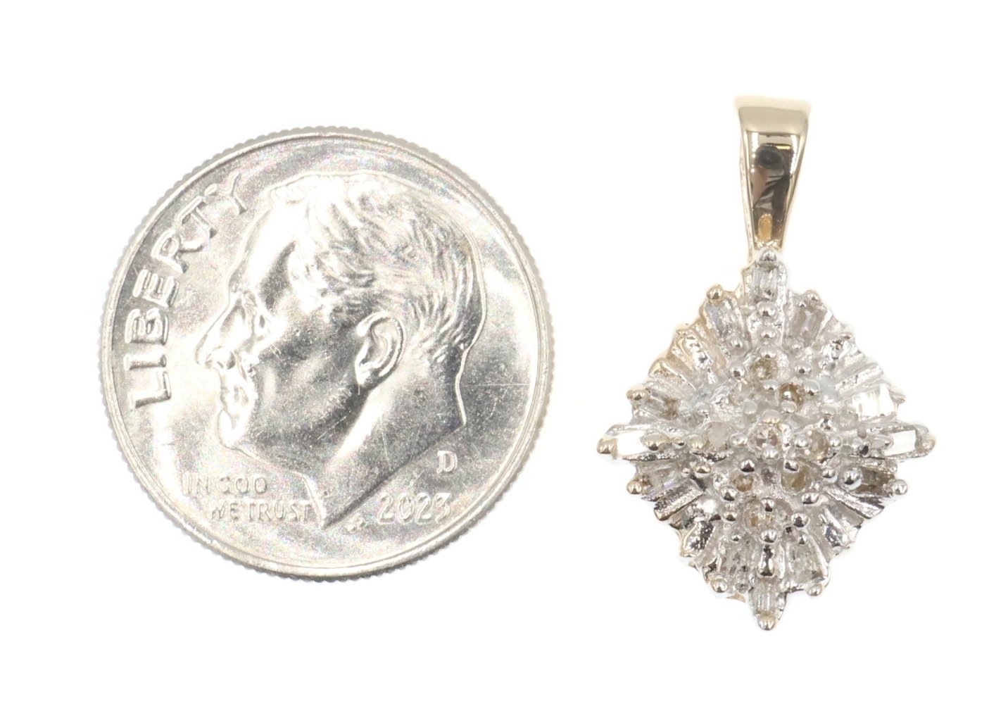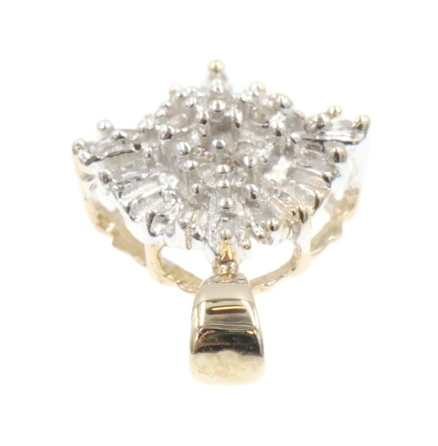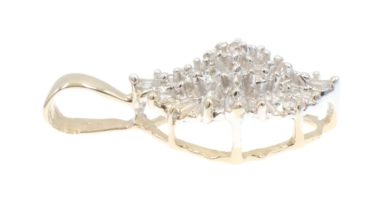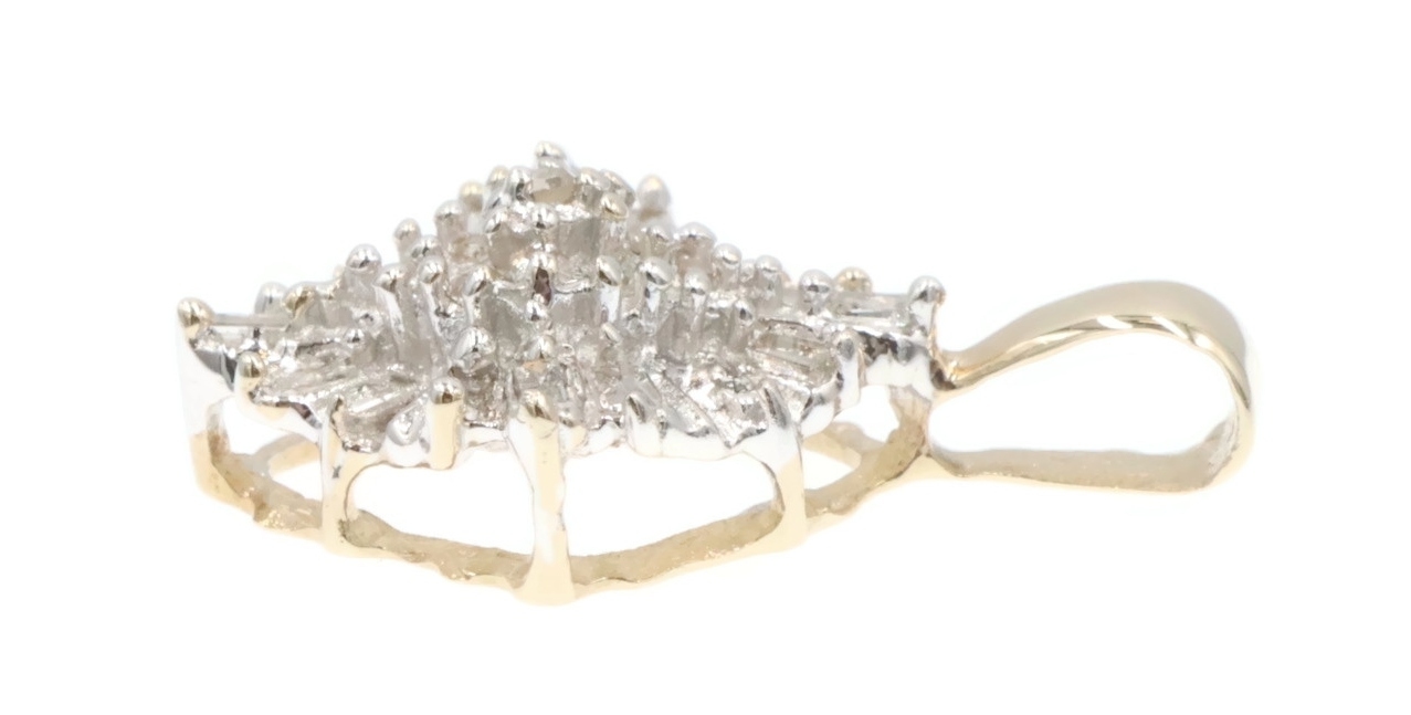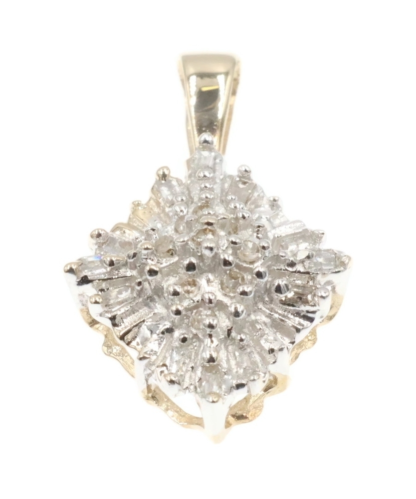 Women's 10KT Gold 0.25 Ctw Round & Baguette Diamond Rhombus Cluster Pendant 0.8". This pendant is approximately 20.6mm in length (including the bail) and 12.9mm in width.