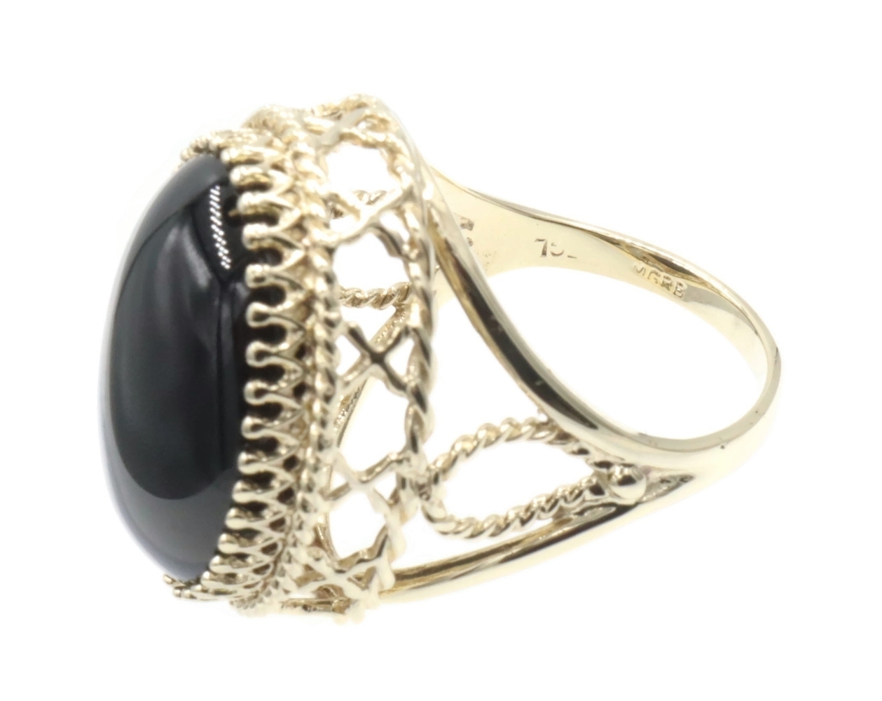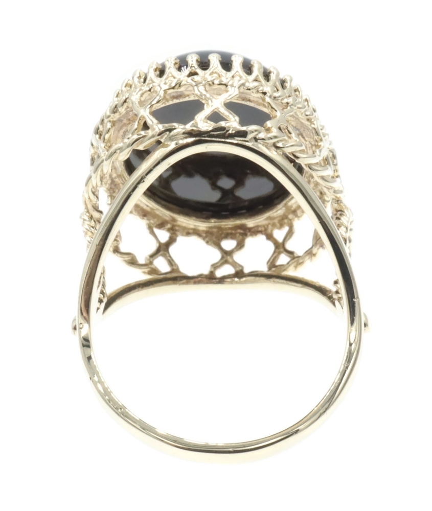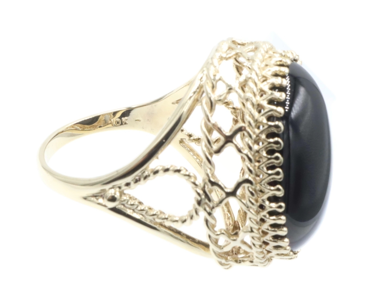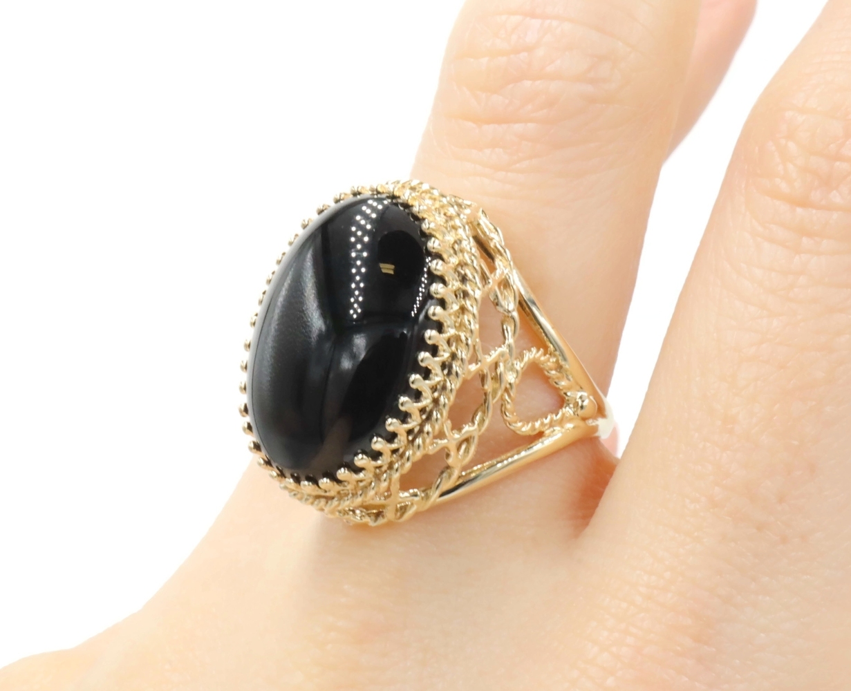 Women's 12.65 Ct Oval Cabochon Black Onyx 10KT Gold Filigree Cocktail Ring MGRB. This ring is a size 7 1/4.