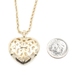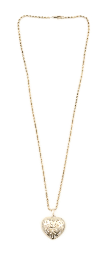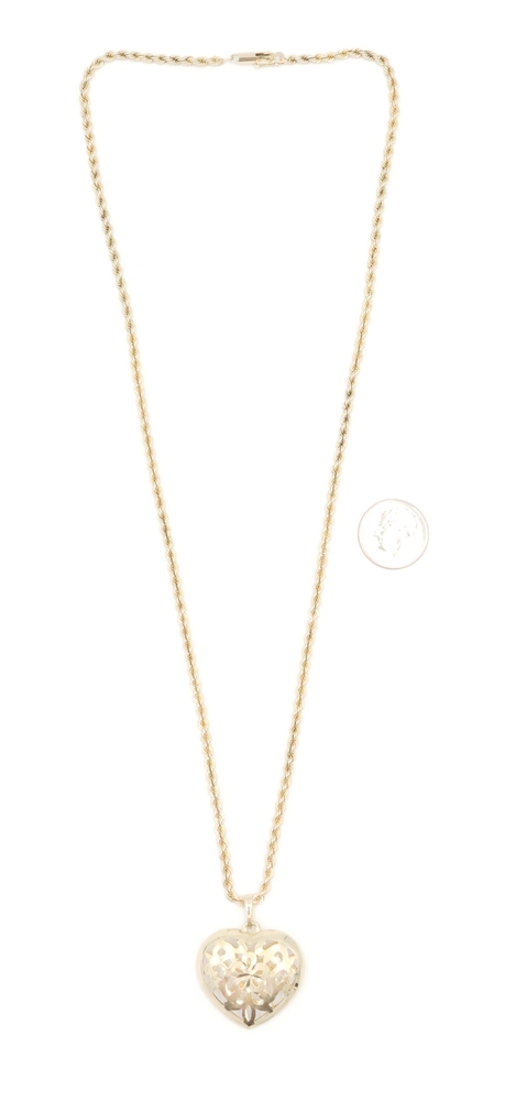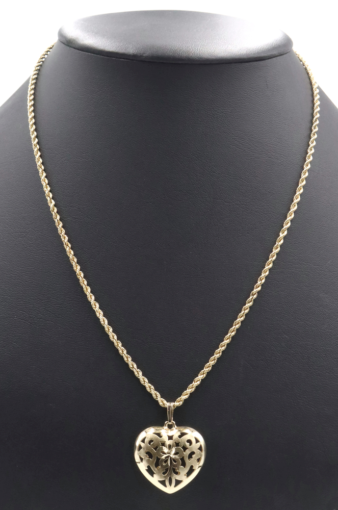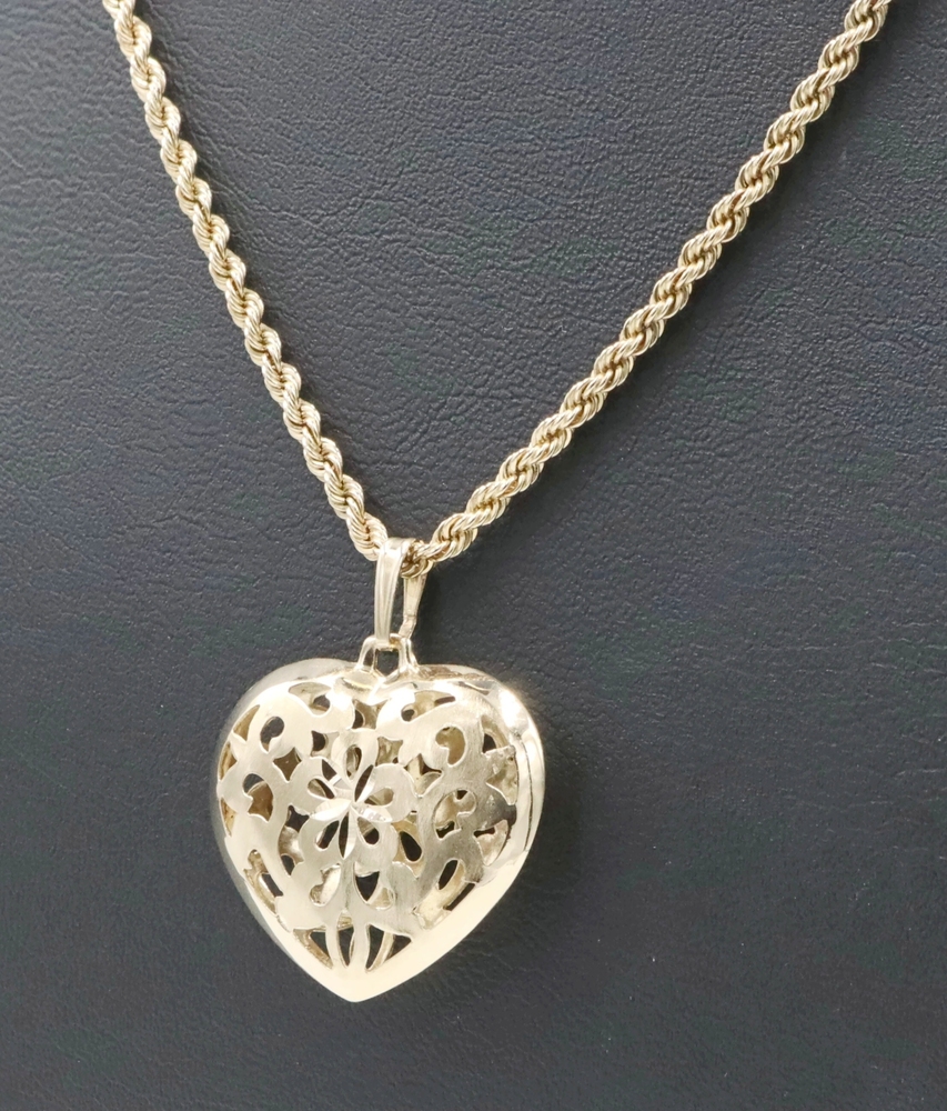 Women's 14KT Yellow Gold Openwork Floral Heart Pendant on 14KT Rope Necklace 20". This pendant is approximately 32.6mm in length (including the bail) and the rope necklace is approximately 20 inches in length.