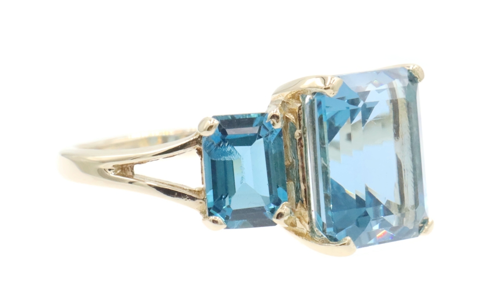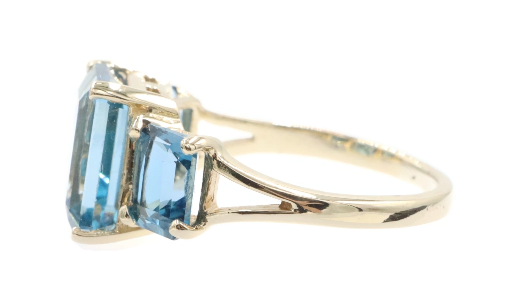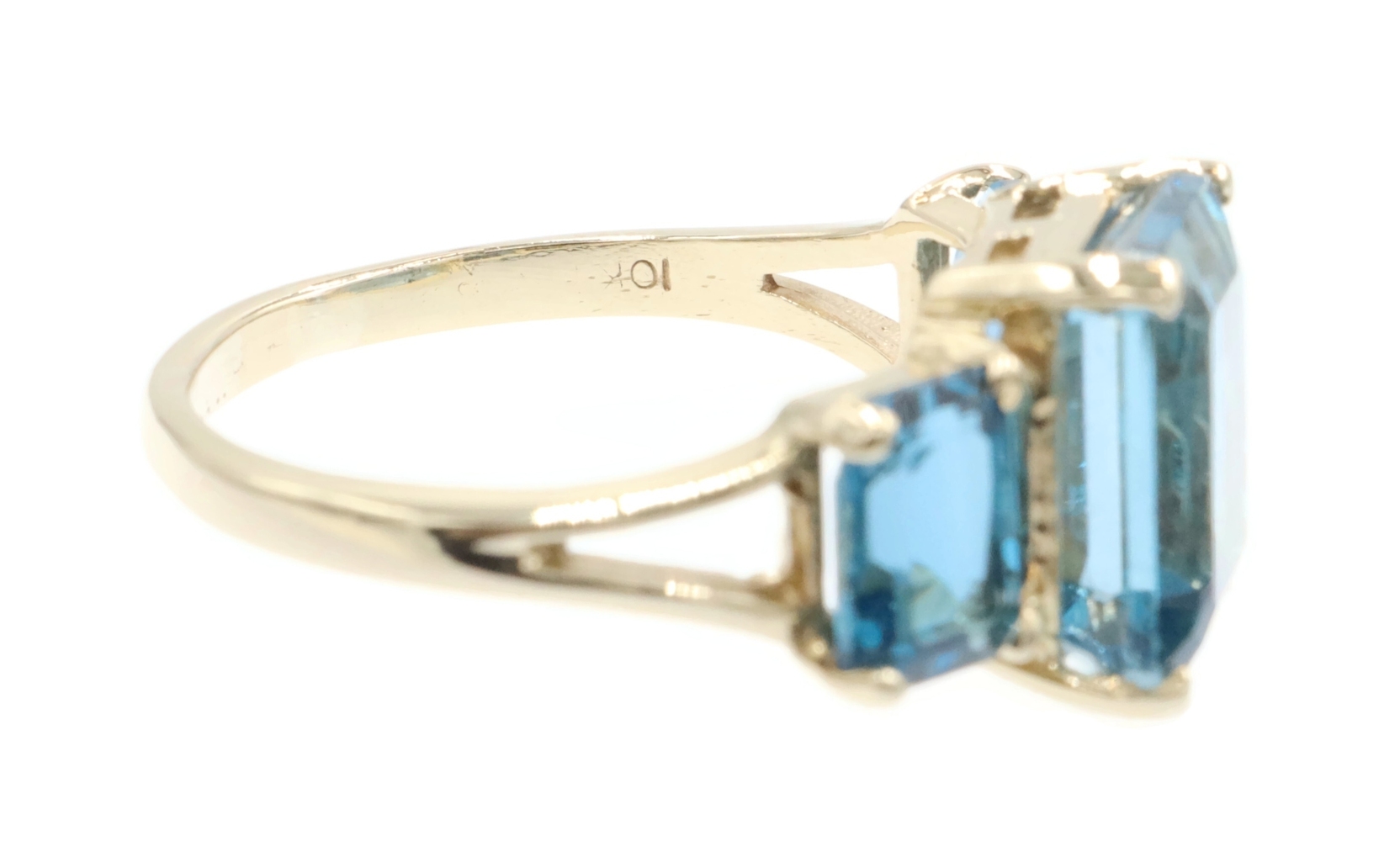 Women's 3-Stone 7.60 Ctw Emerald Cut Blue Topaz 10KT Yellow Gold Ring - 4.5g | USA Pawn