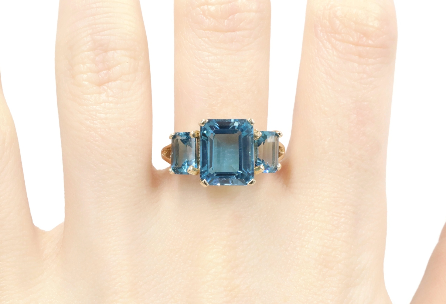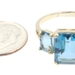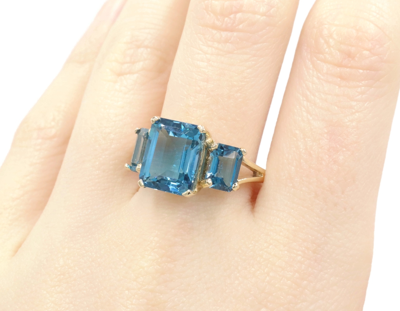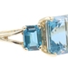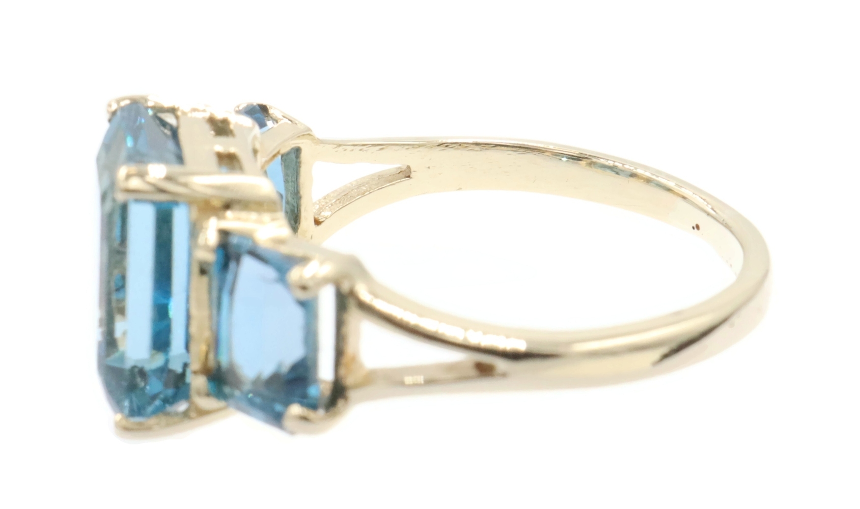 Women's 3-Stone 7.60 Ctw Emerald Cut Blue Topaz 10KT Yellow Gold Ring - 4.5g | USA Pawn
