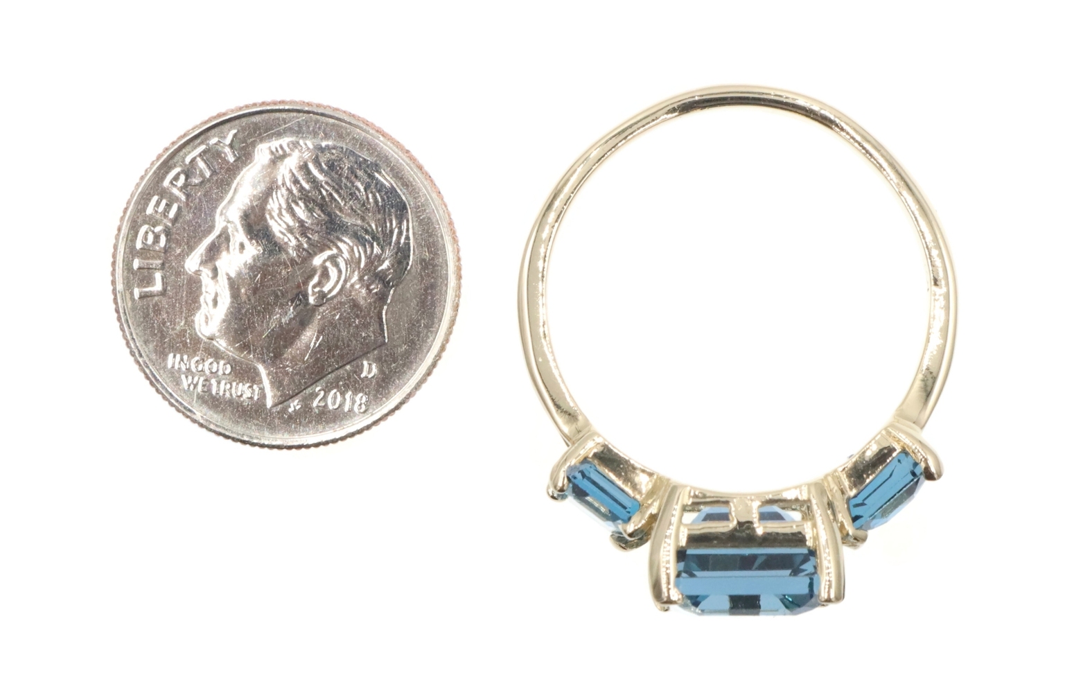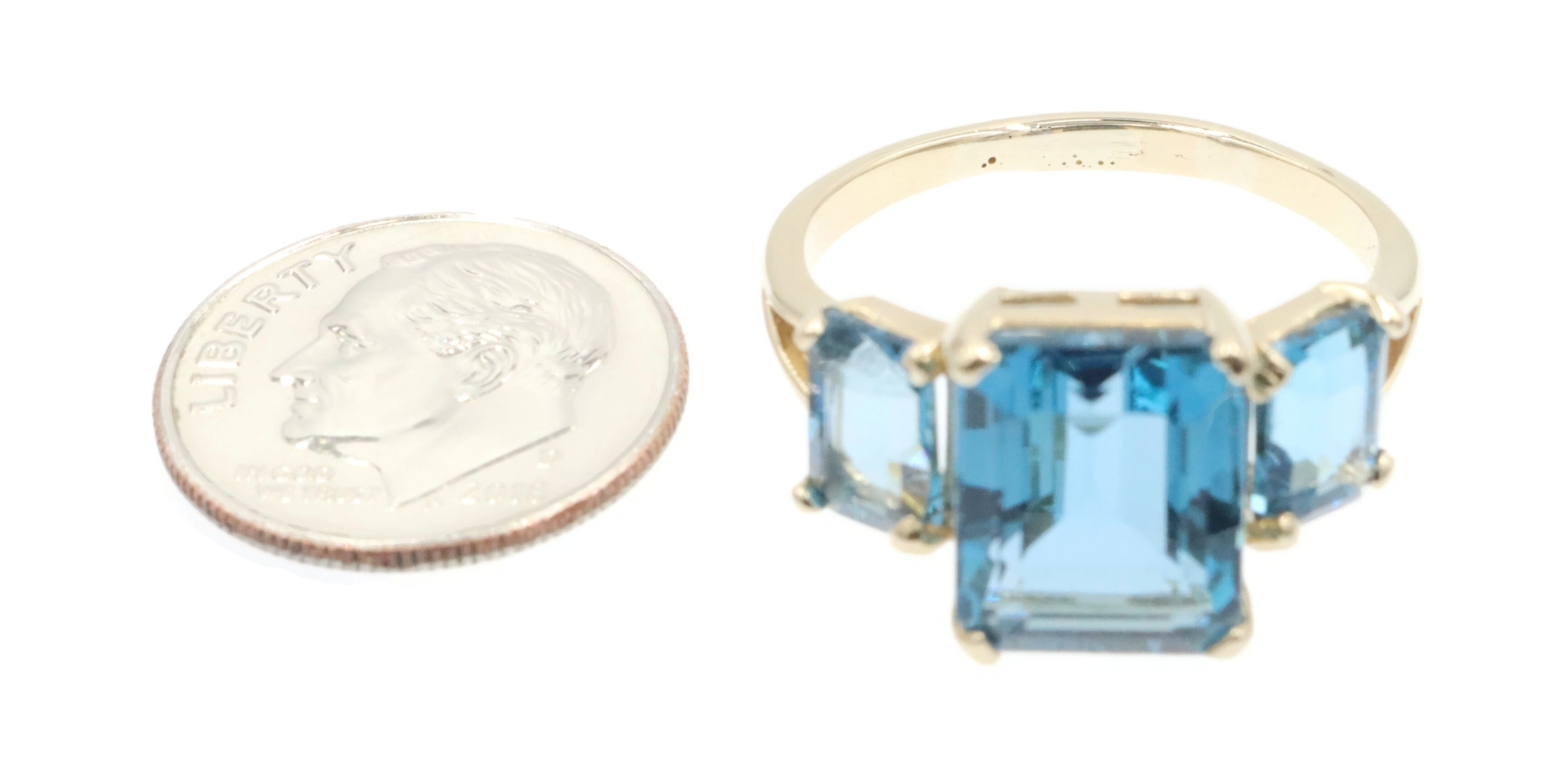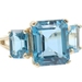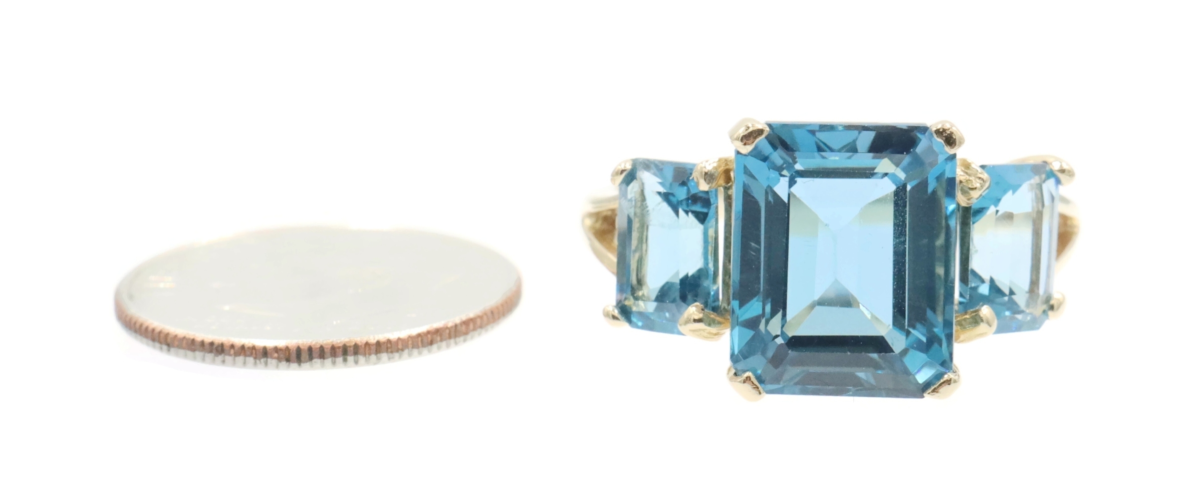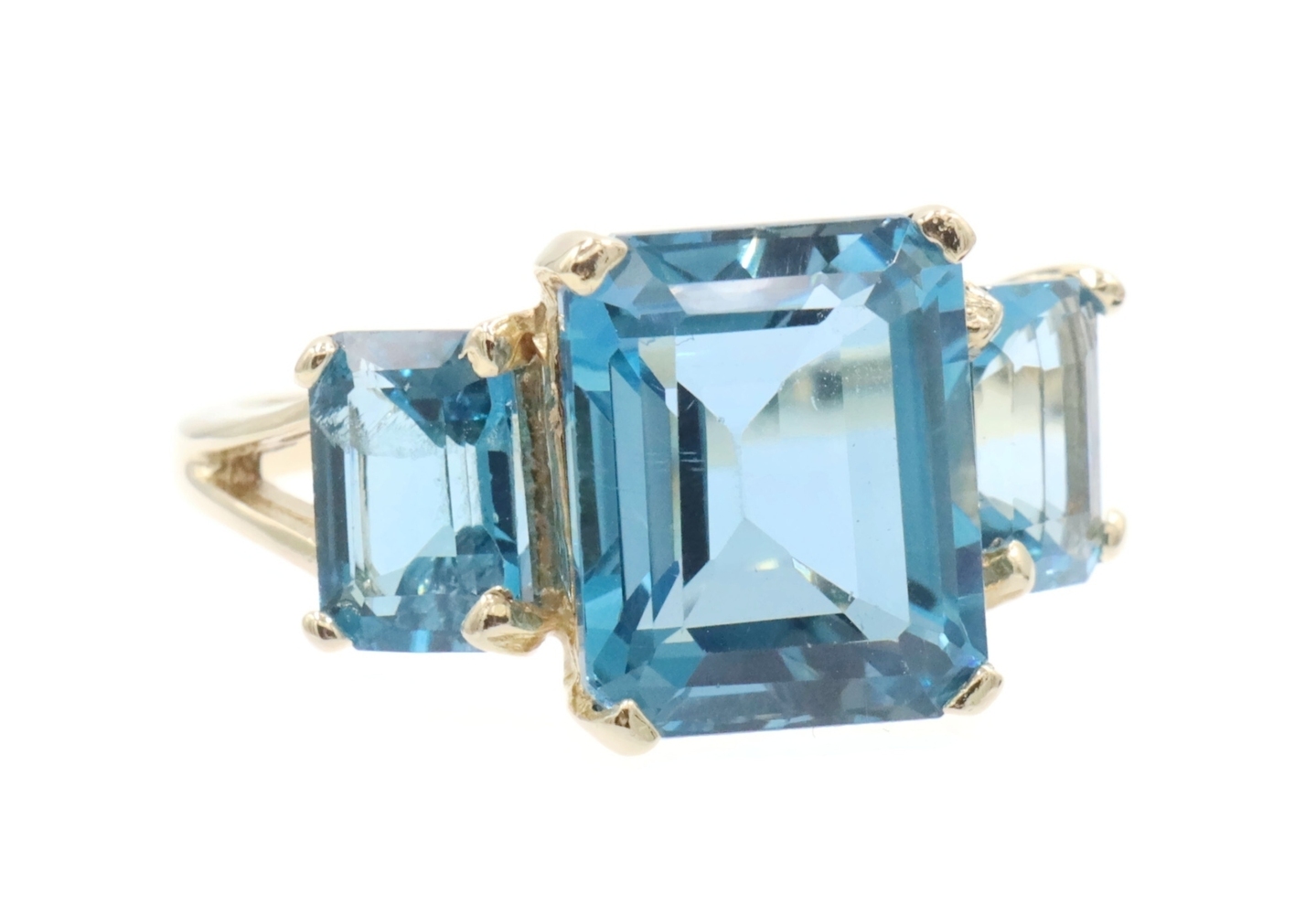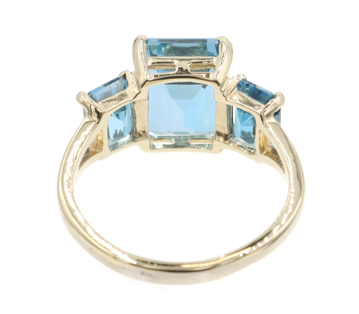 Women's 3-Stone 7.60 Ctw Emerald Cut Blue Topaz 10KT Yellow Gold Ring - 4.5g. This ring is a size 9.