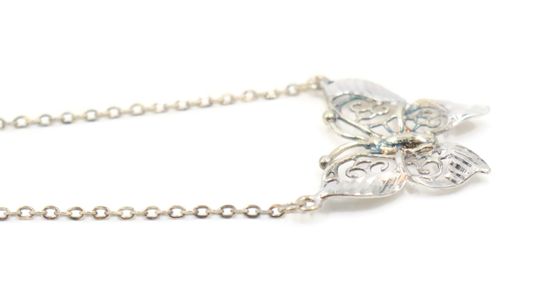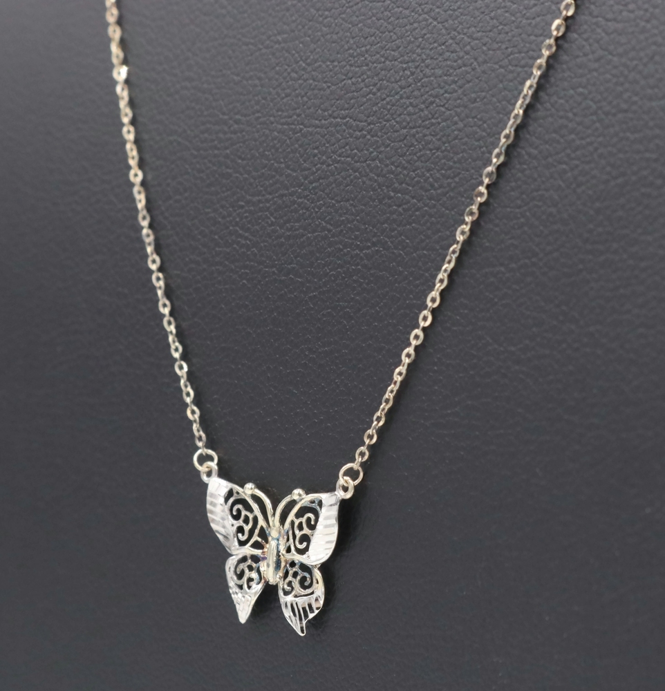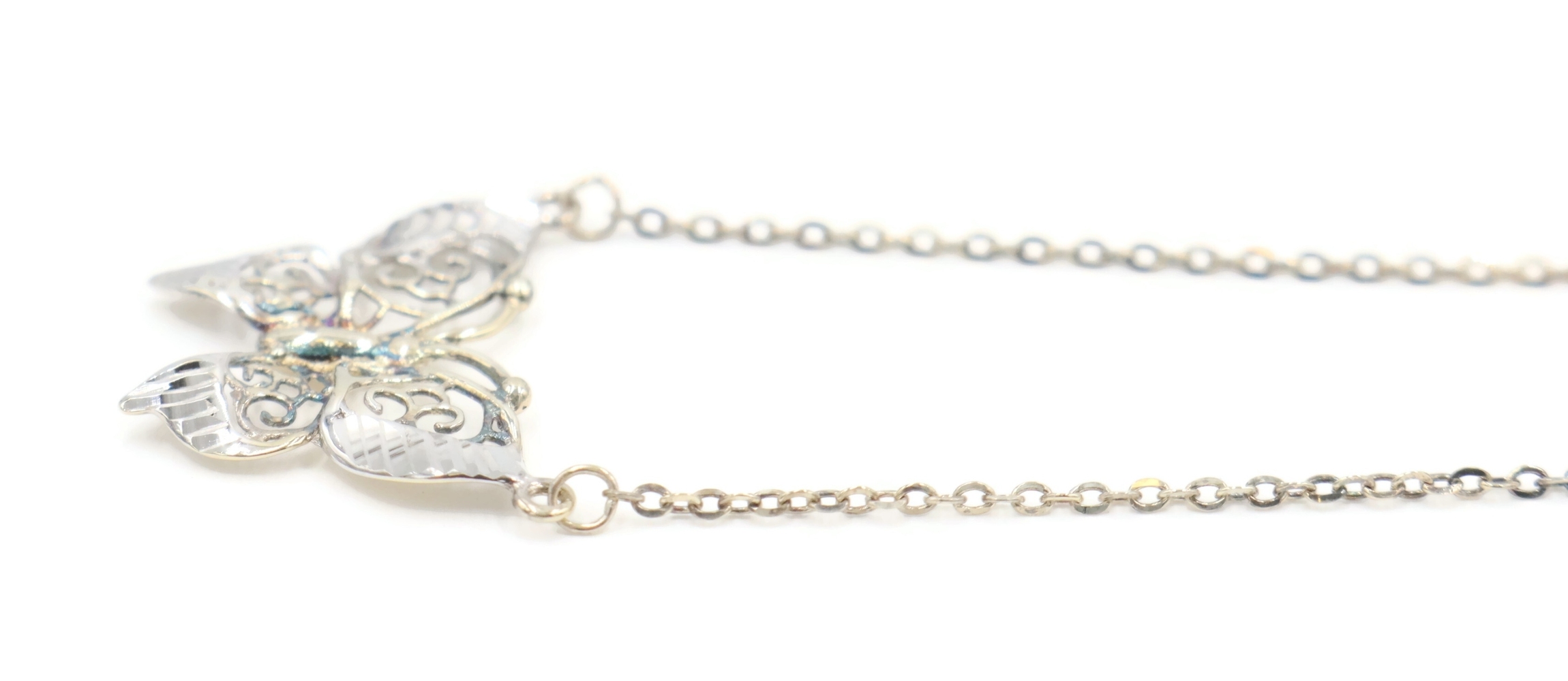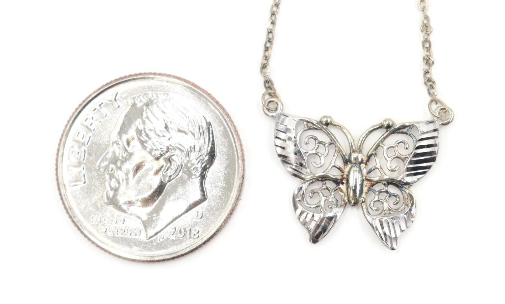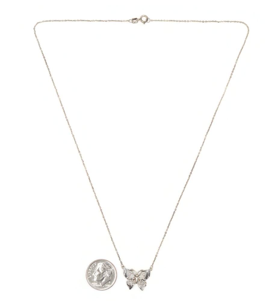 Women's Diamond-Cut 14KT White Gold Butterfly Cable Chain Necklace 18" AE 1.34g. This necklace has an approximate wearable length of 18 inches and the butterfly pendant is approximately 17.7mm in width.