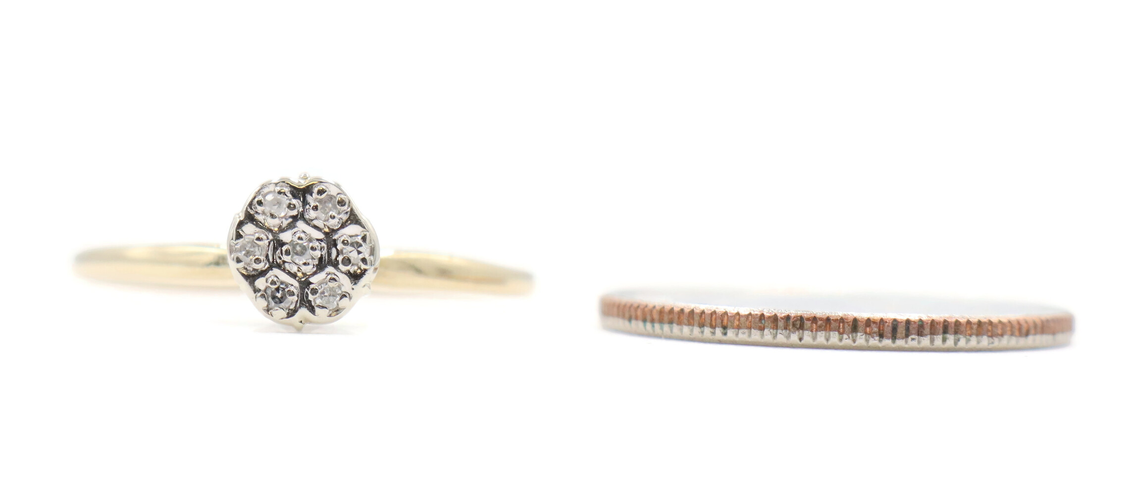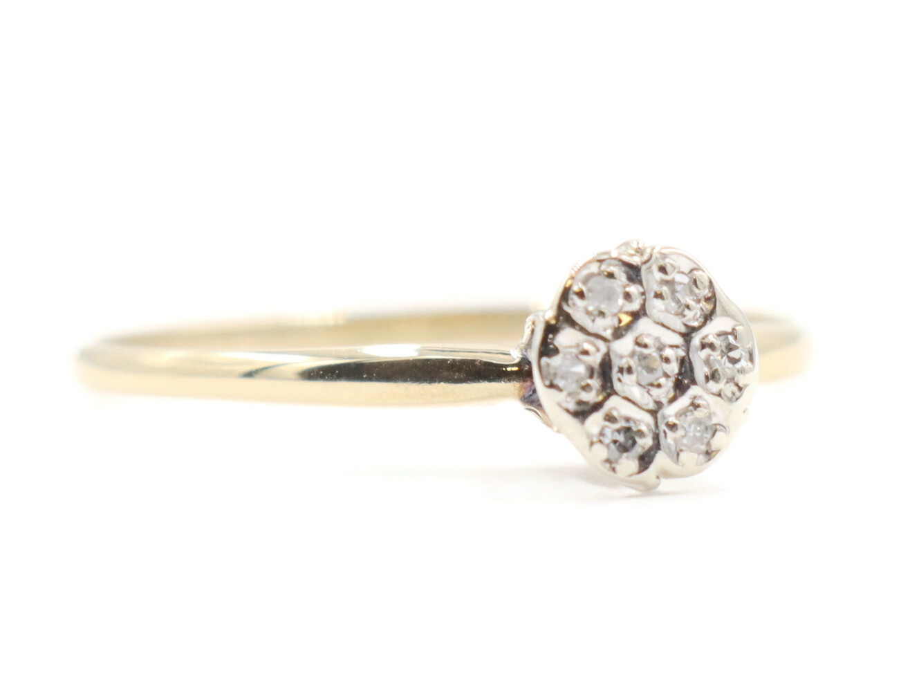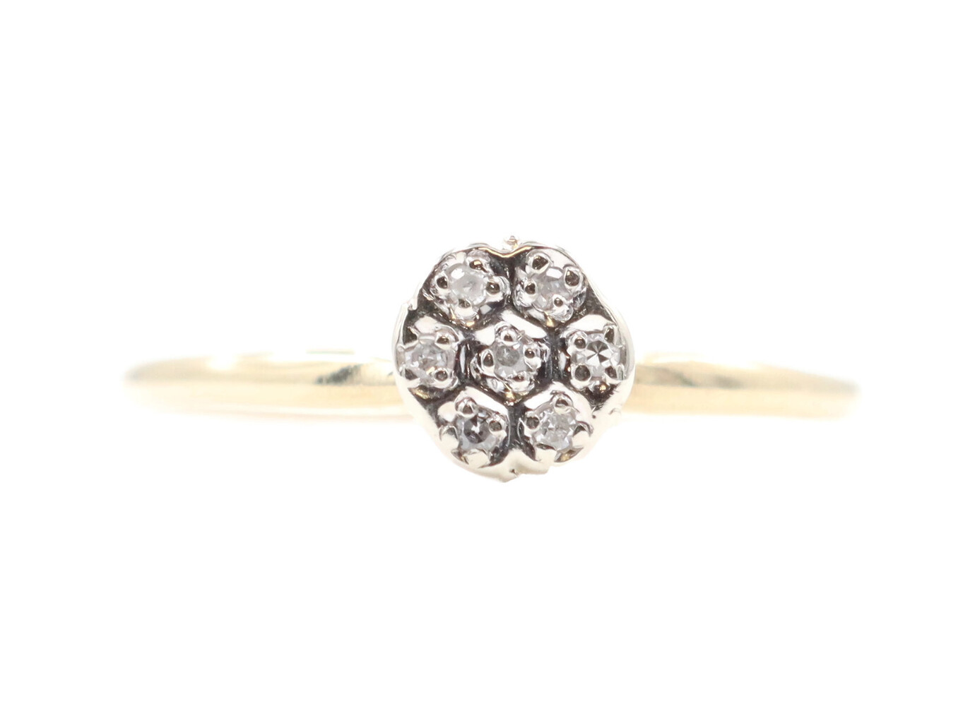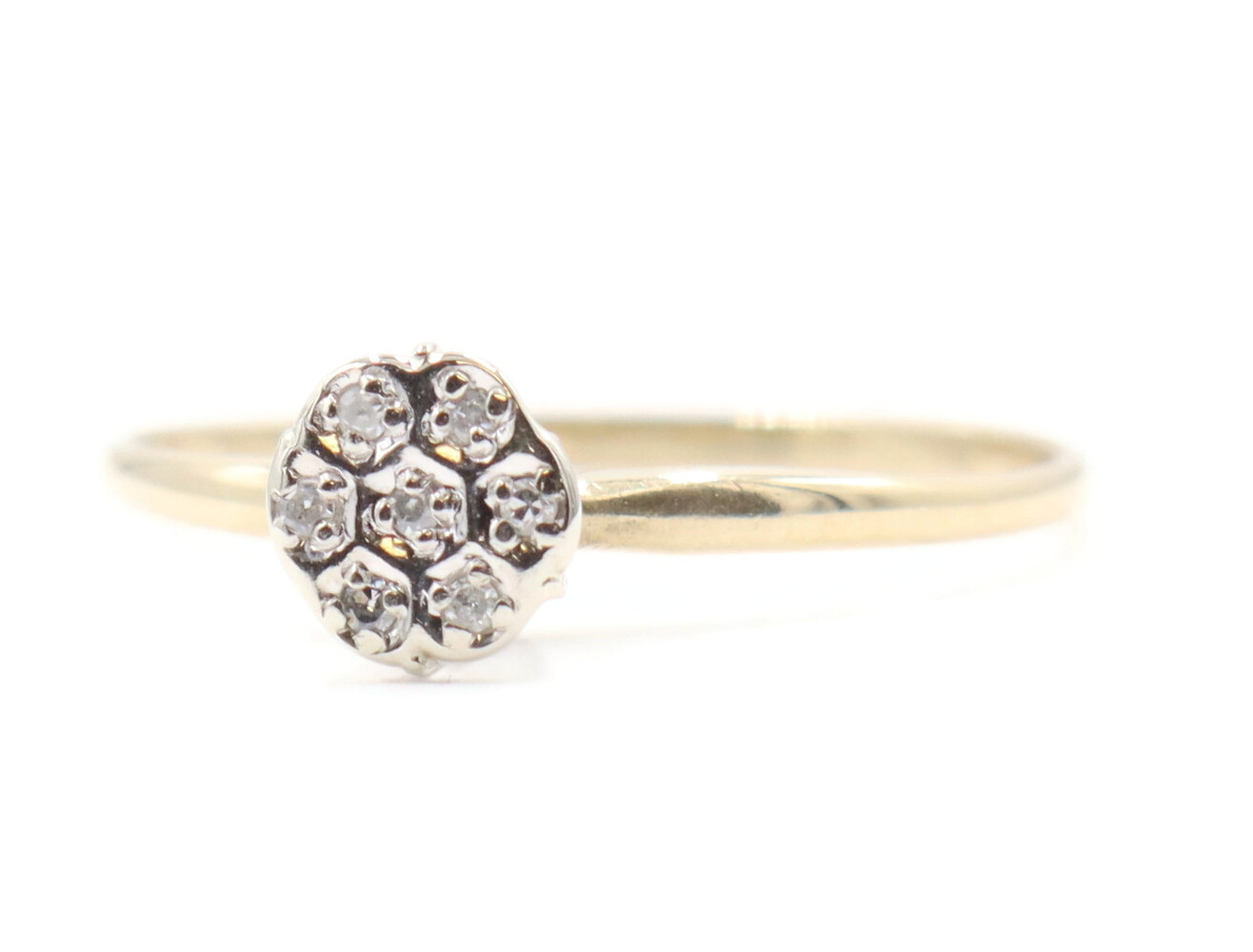 Women's Estate 10KT Yellow Gold 0.04 ctw Round Diamond Flower Cluster Ring. This ring is a size 6 3/4 and features 7 round single cut diamonds with a total approximate diamond carat weight of 0.04 ctw.