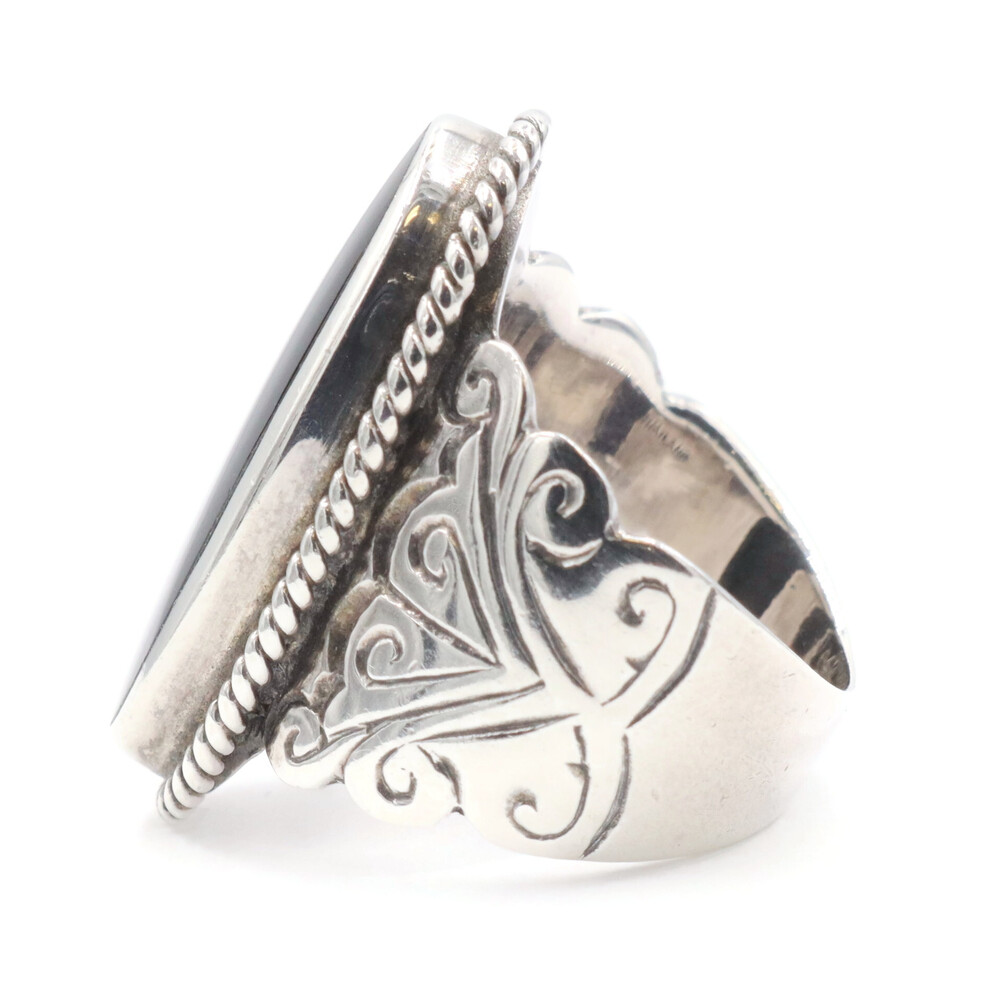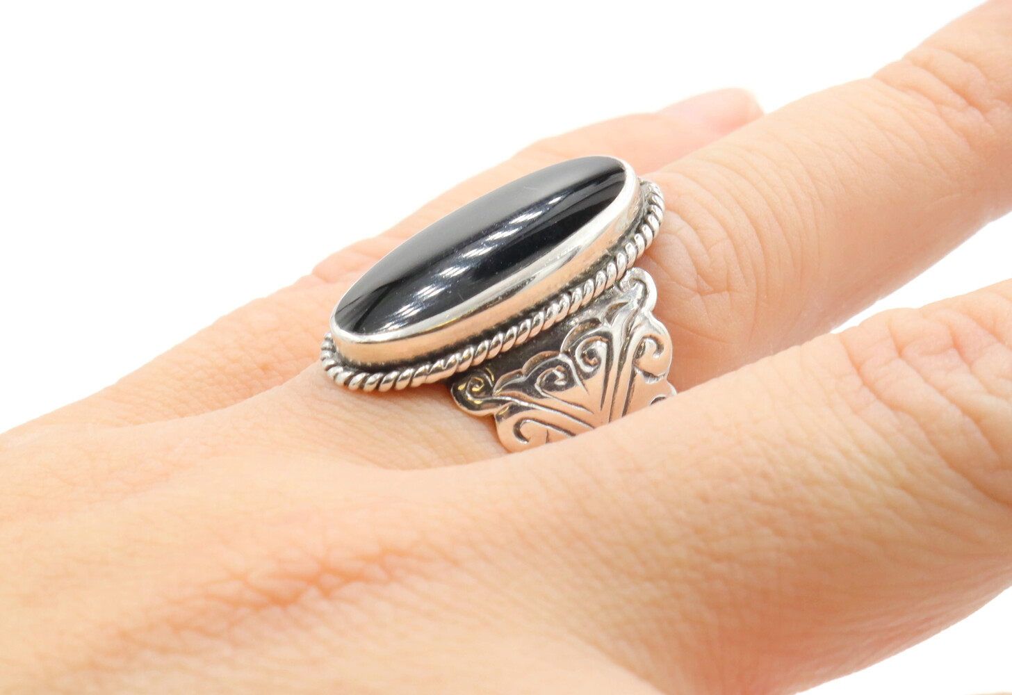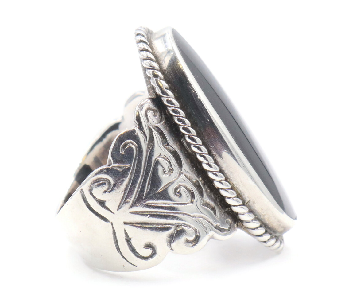 Women's Estate Sterling Silver Oval Cabochon Cut Onyx Solitaire Filigree Ring | USA Pawn
