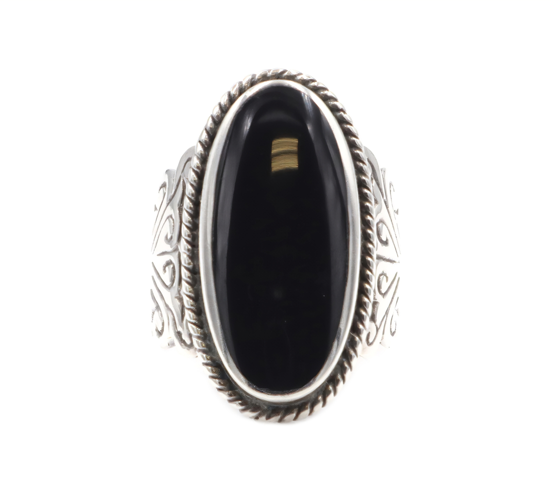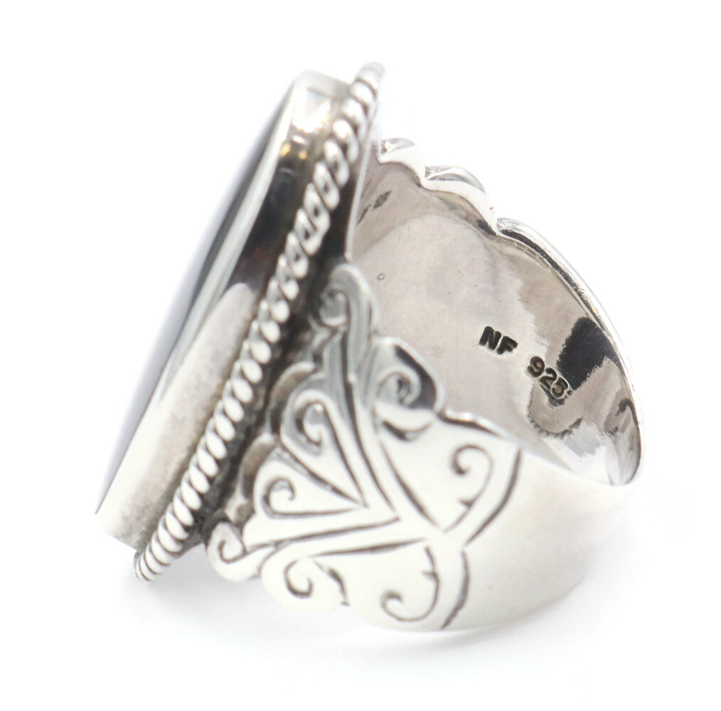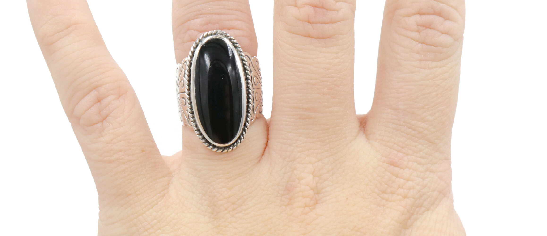 Women's Estate Sterling Silver Oval Cabochon Cut Onyx Solitaire Filigree Ring | USA Pawn