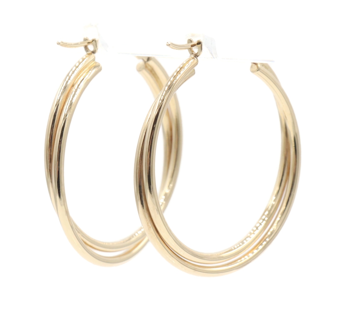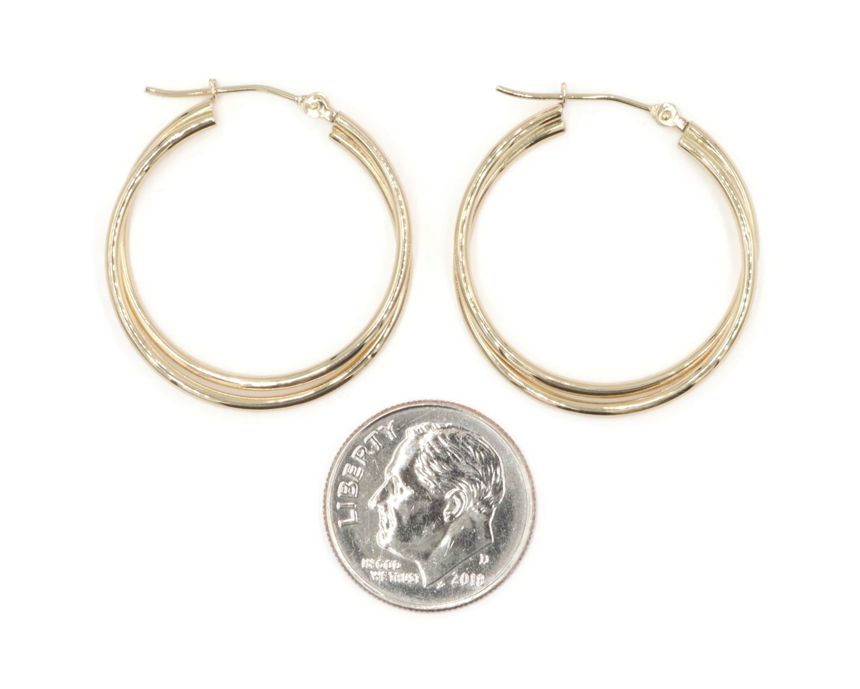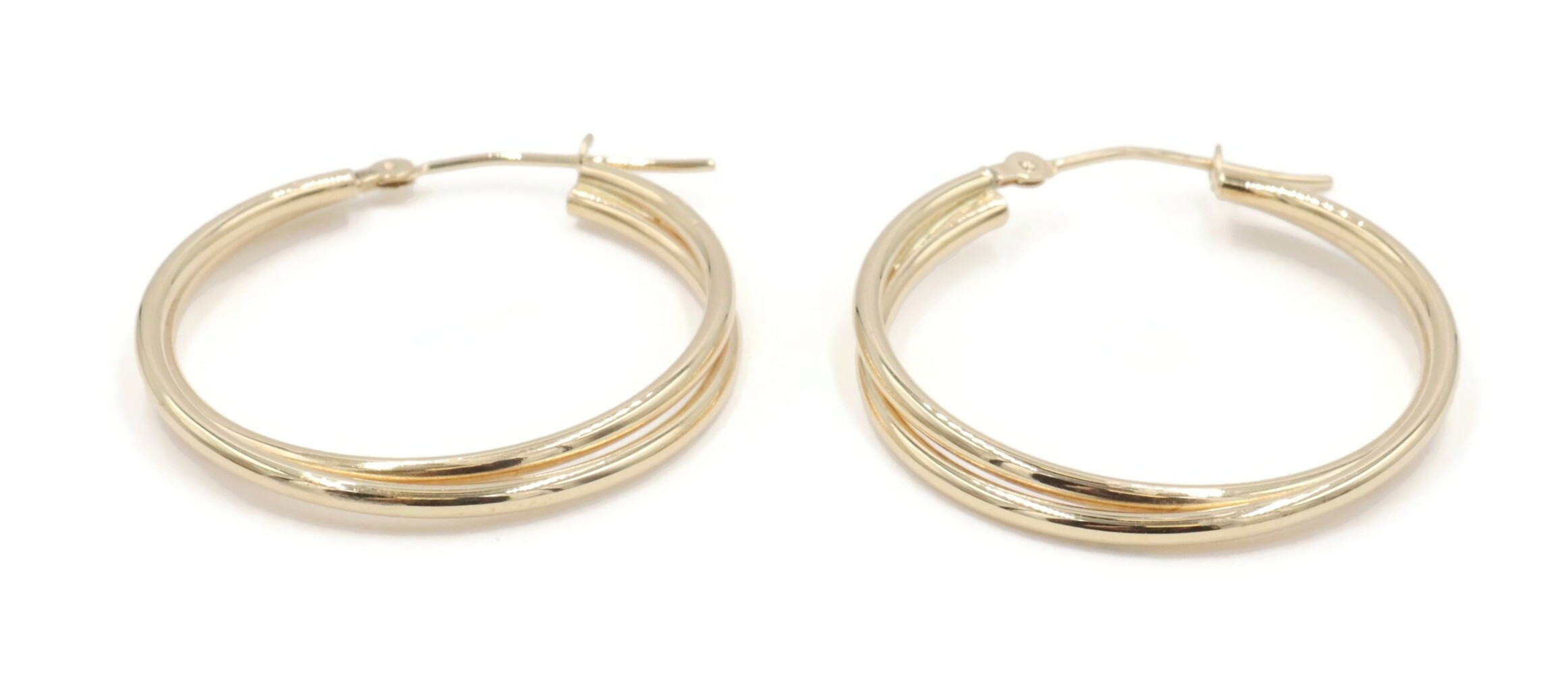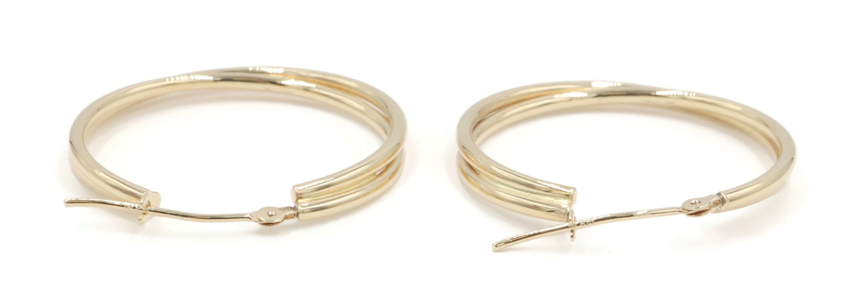 Women's Fancy 14KT Yellow Gold 26.5mm Double Hoop Hinged Earrings RL 1.22g. These earrings each have an approximate hoop size of 26.5mm.