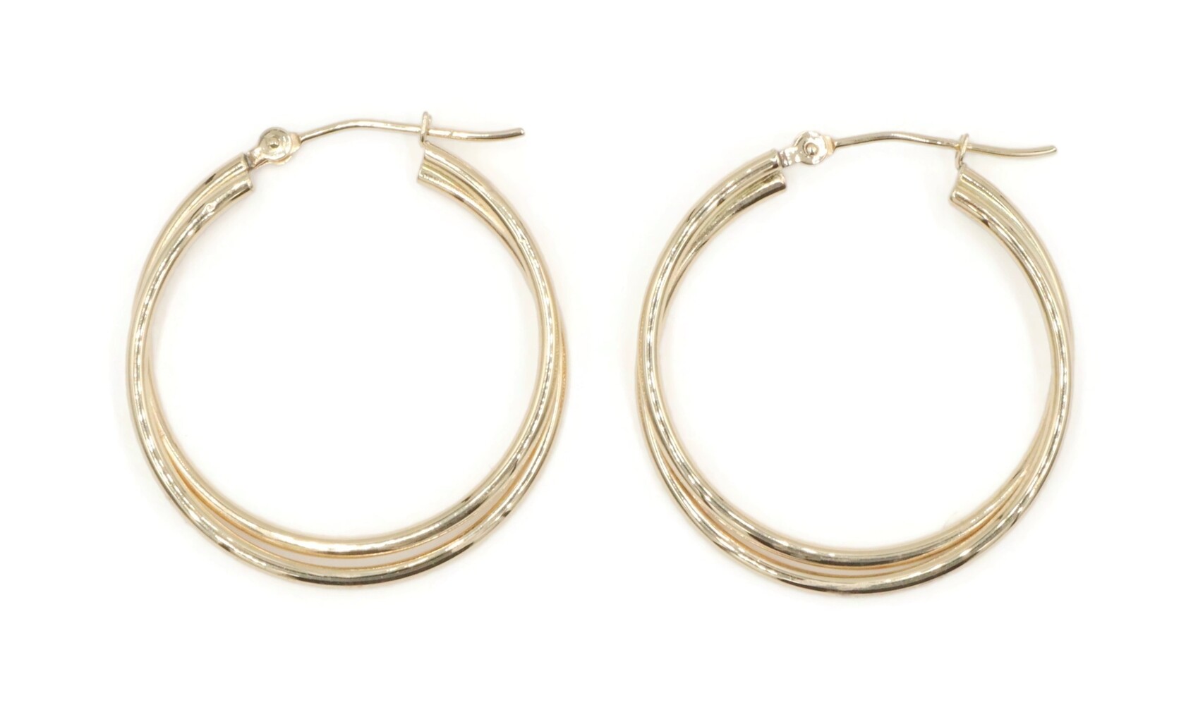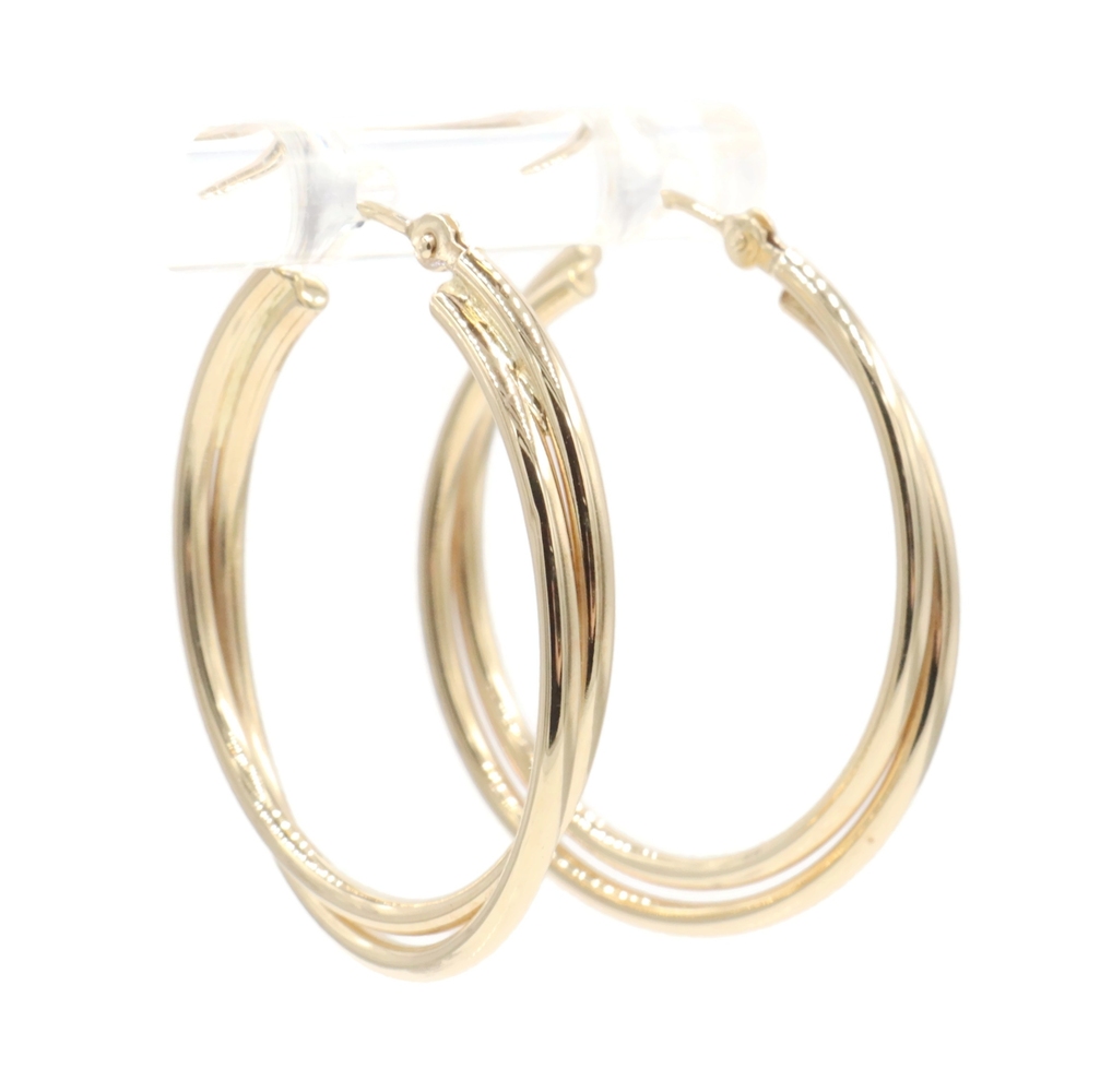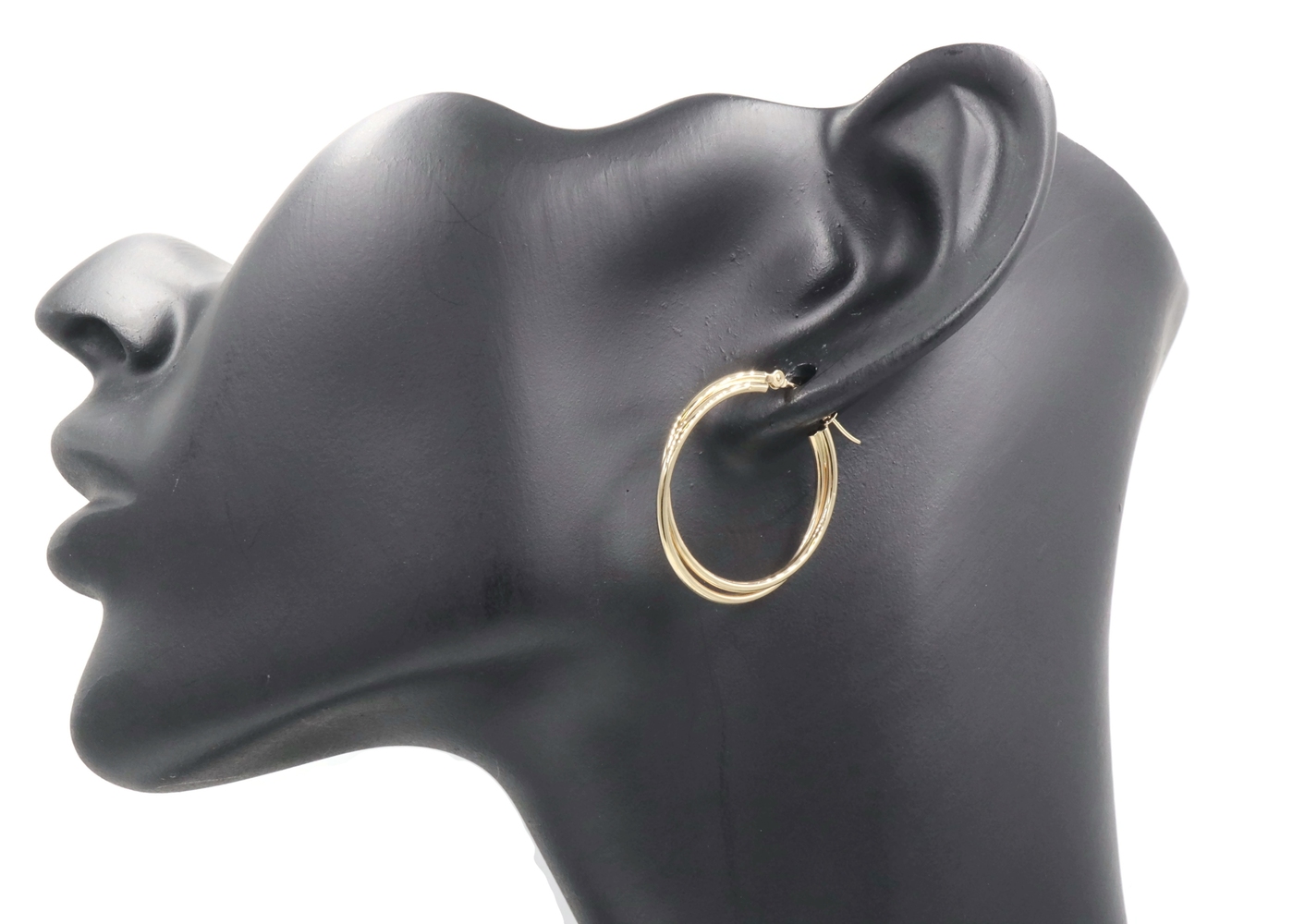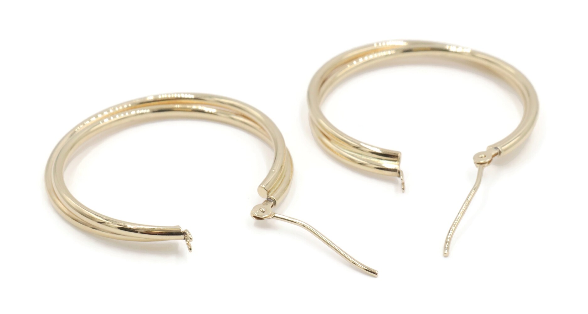 Women's Fancy 14KT Yellow Gold 26.5mm Double Hoop Hinged Earrings RL 1.22g. These earrings each have an approximate hoop size of 26.5mm.