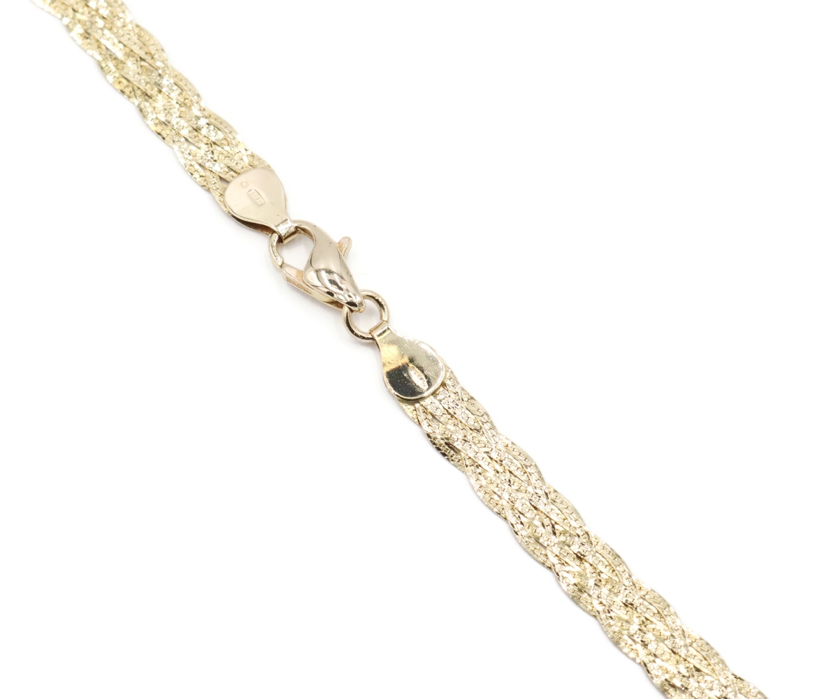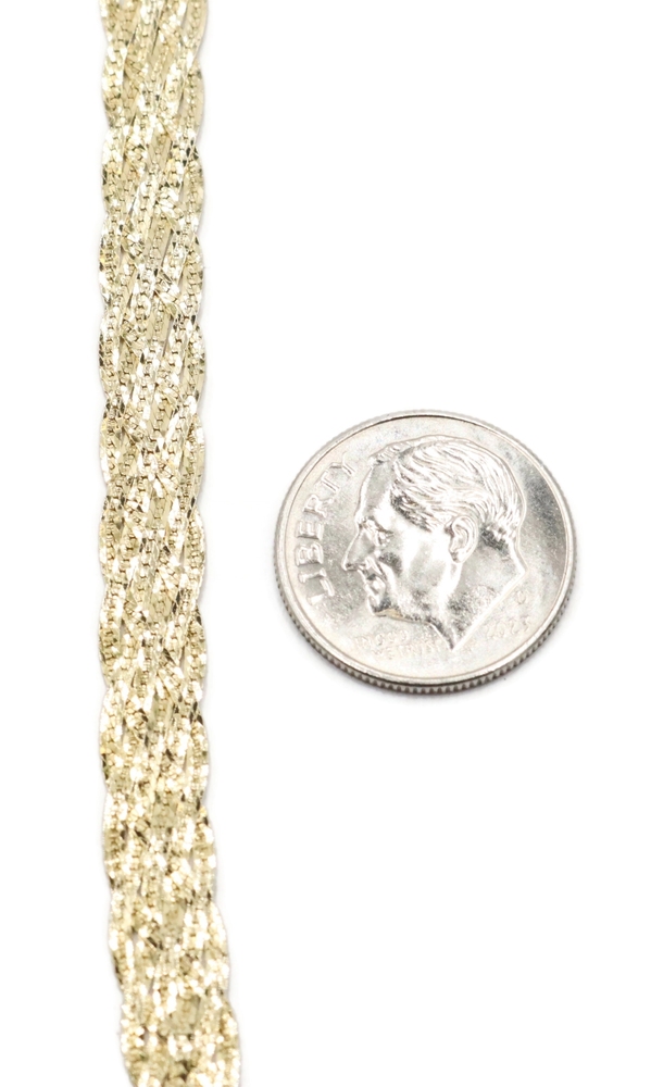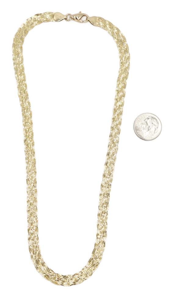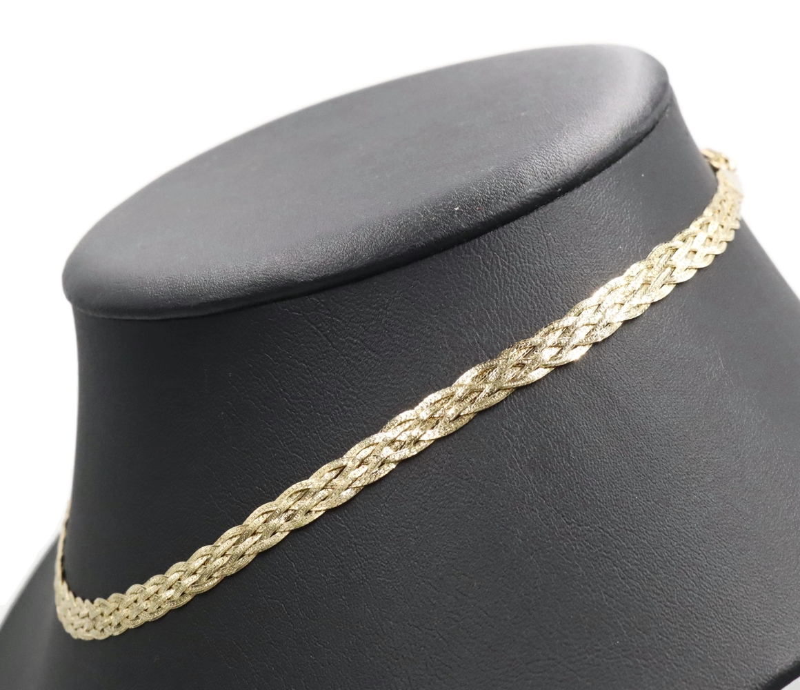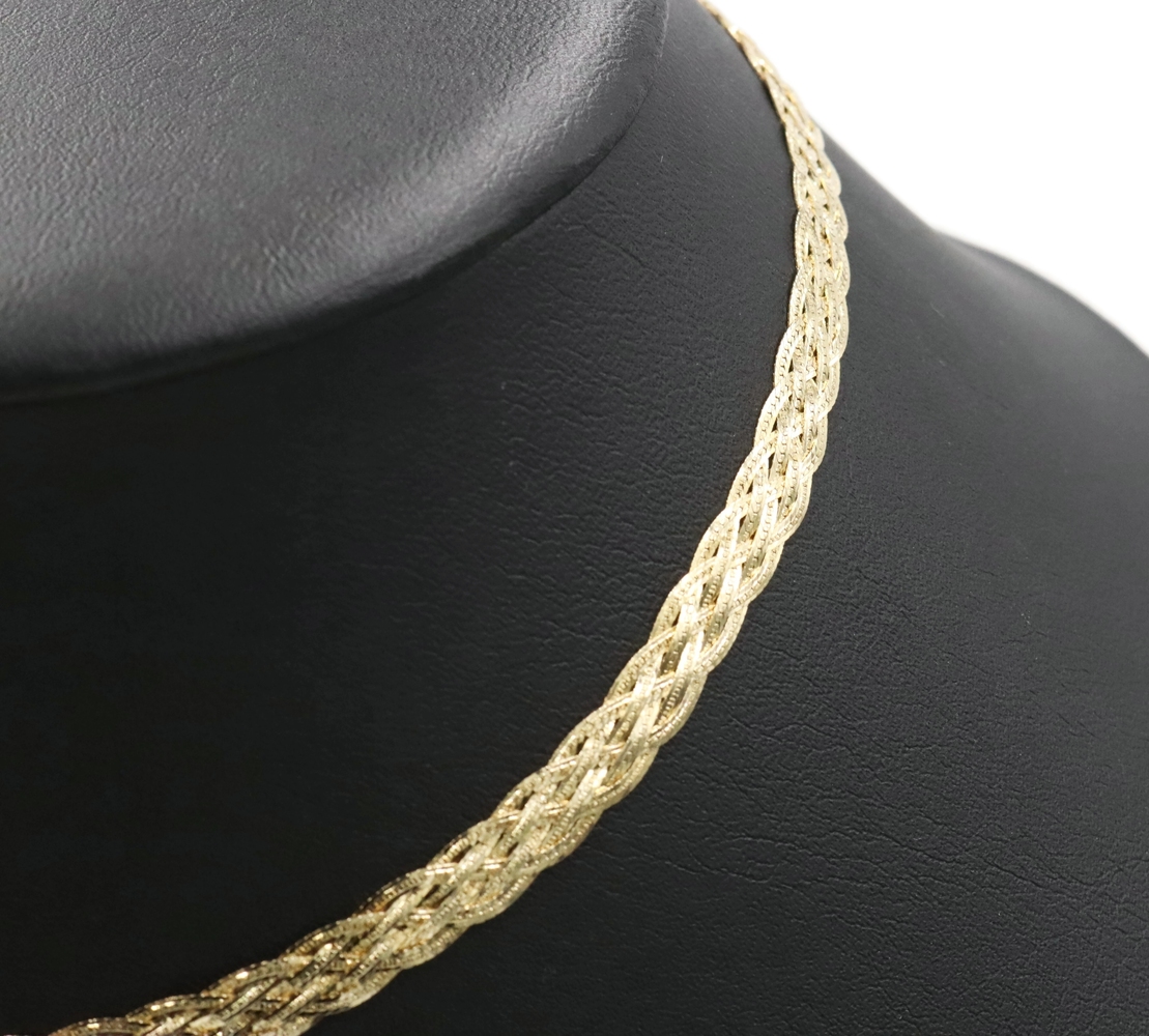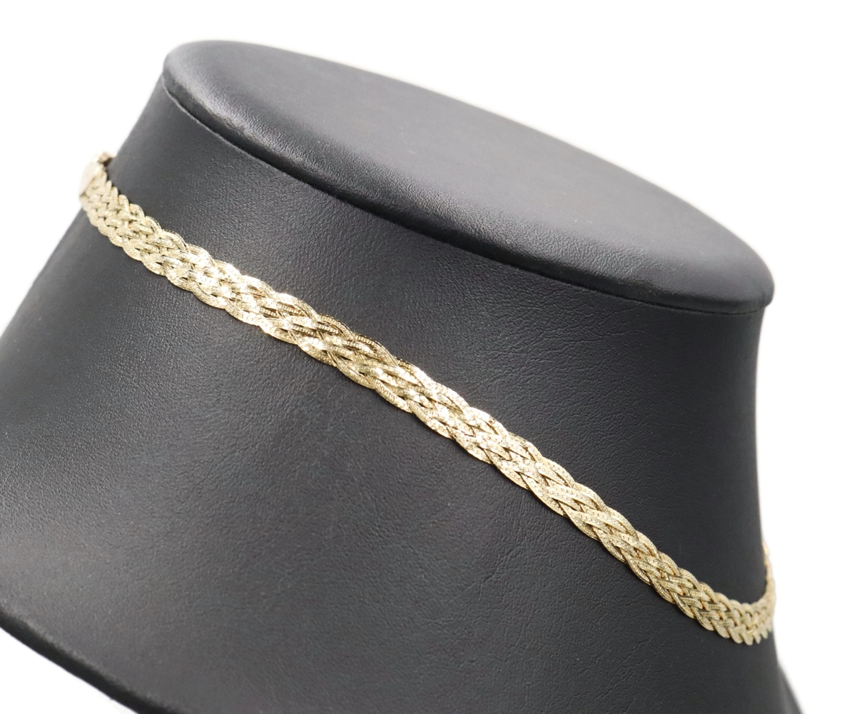 Women's Fancy 14KT Yellow Gold 6.6mm Braided Woven Herringbone Necklace 16" 10g. This necklace is approximately 16 inches in length and 6.6mm in width.