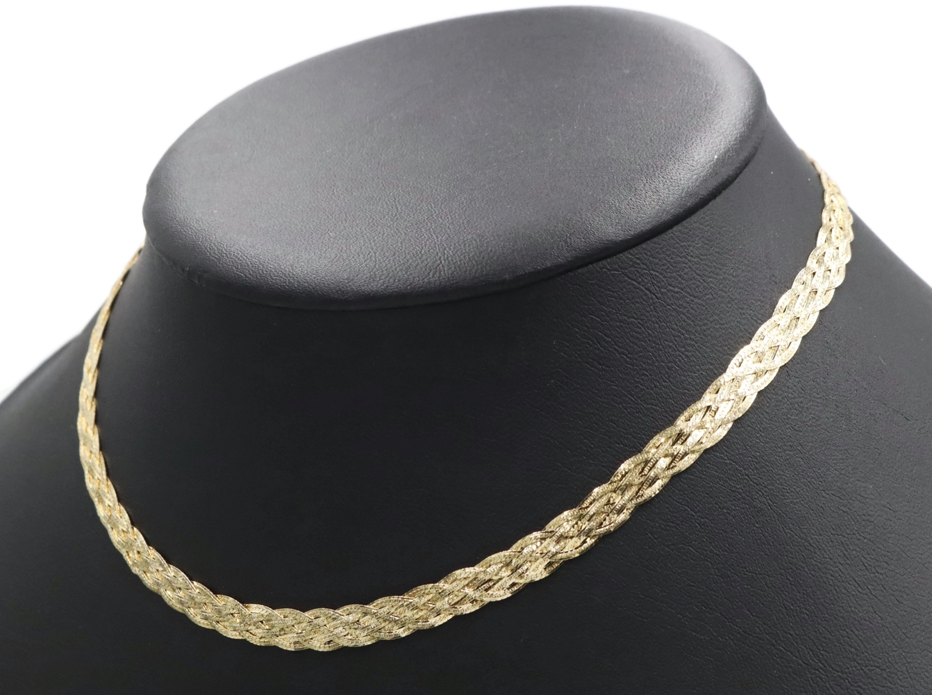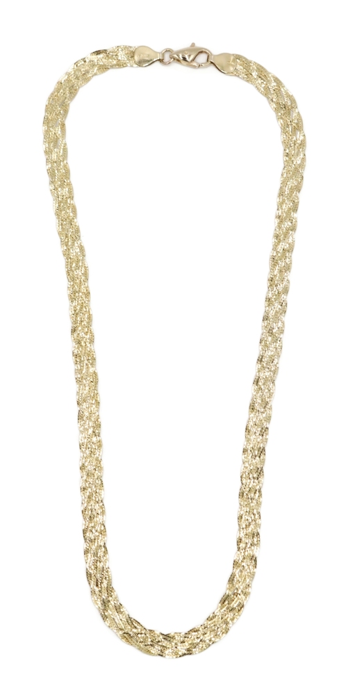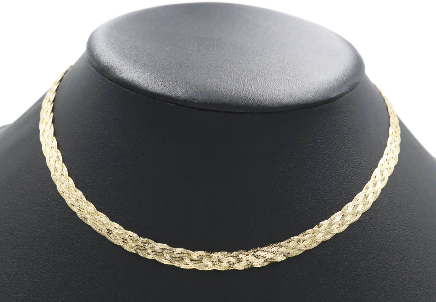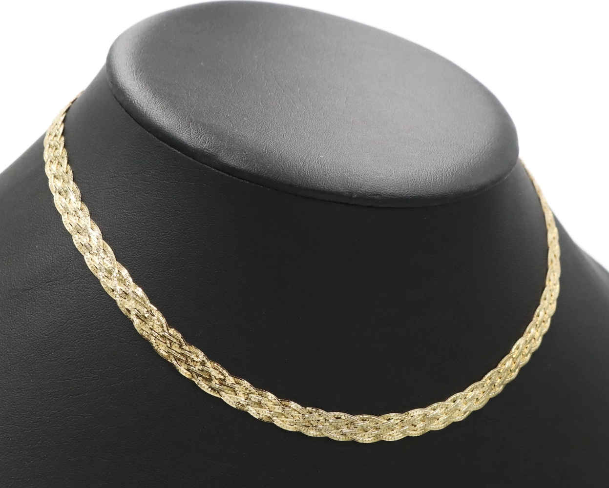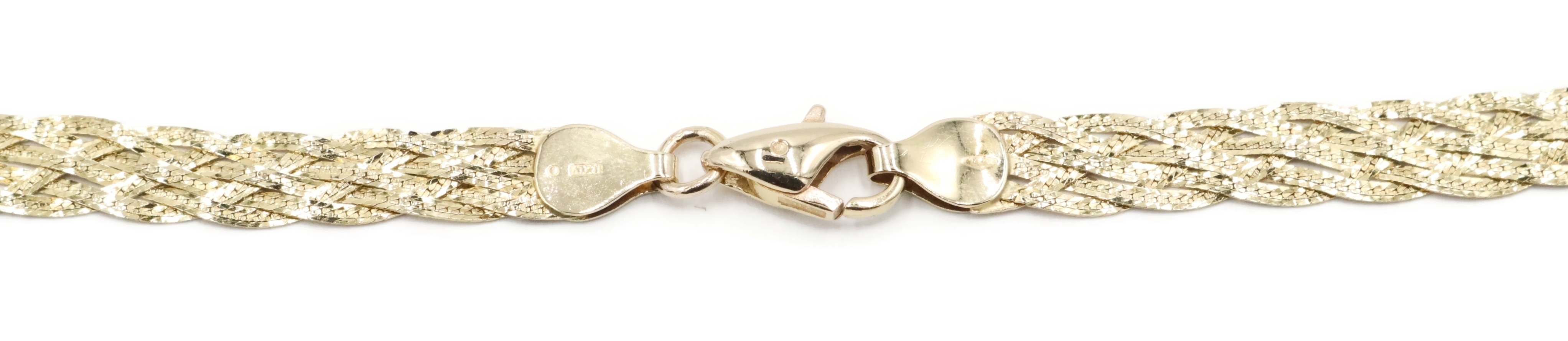 Women's Fancy 14KT Yellow Gold 6.6mm Braided Woven Herringbone Necklace 16" 10g. This necklace is approximately 16 inches in length and 6.6mm in width.