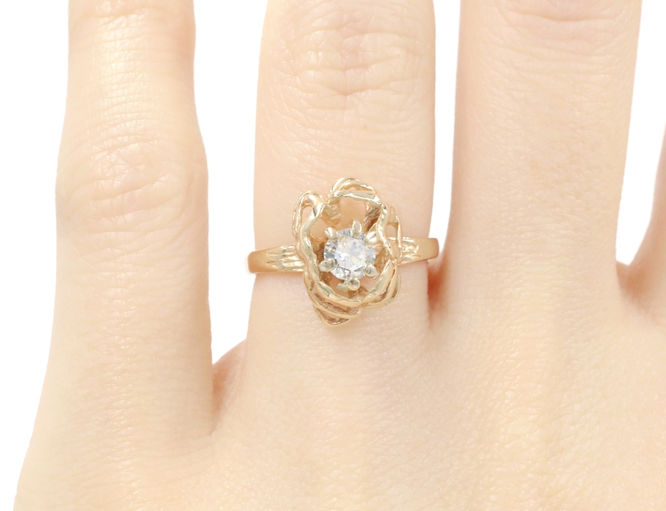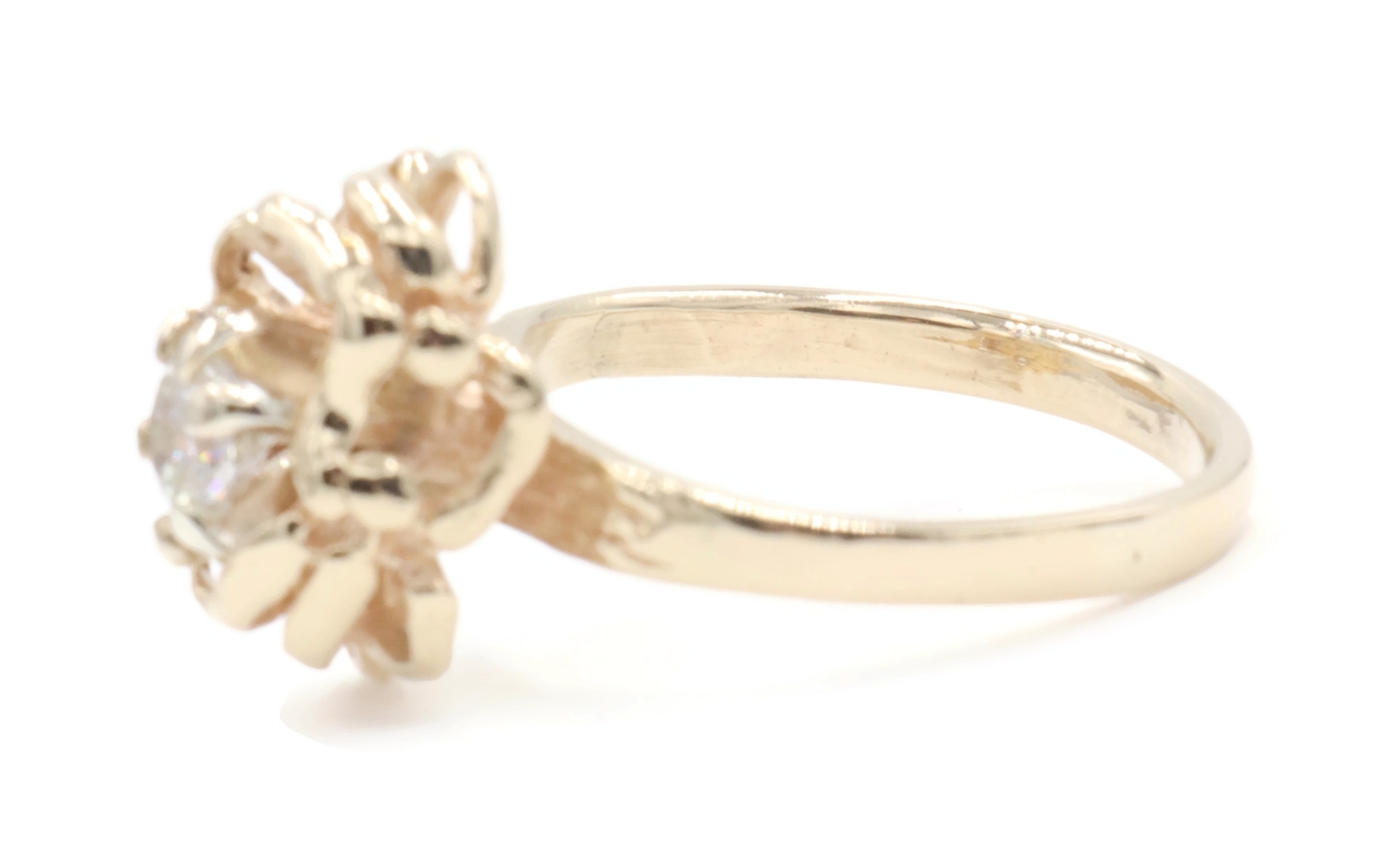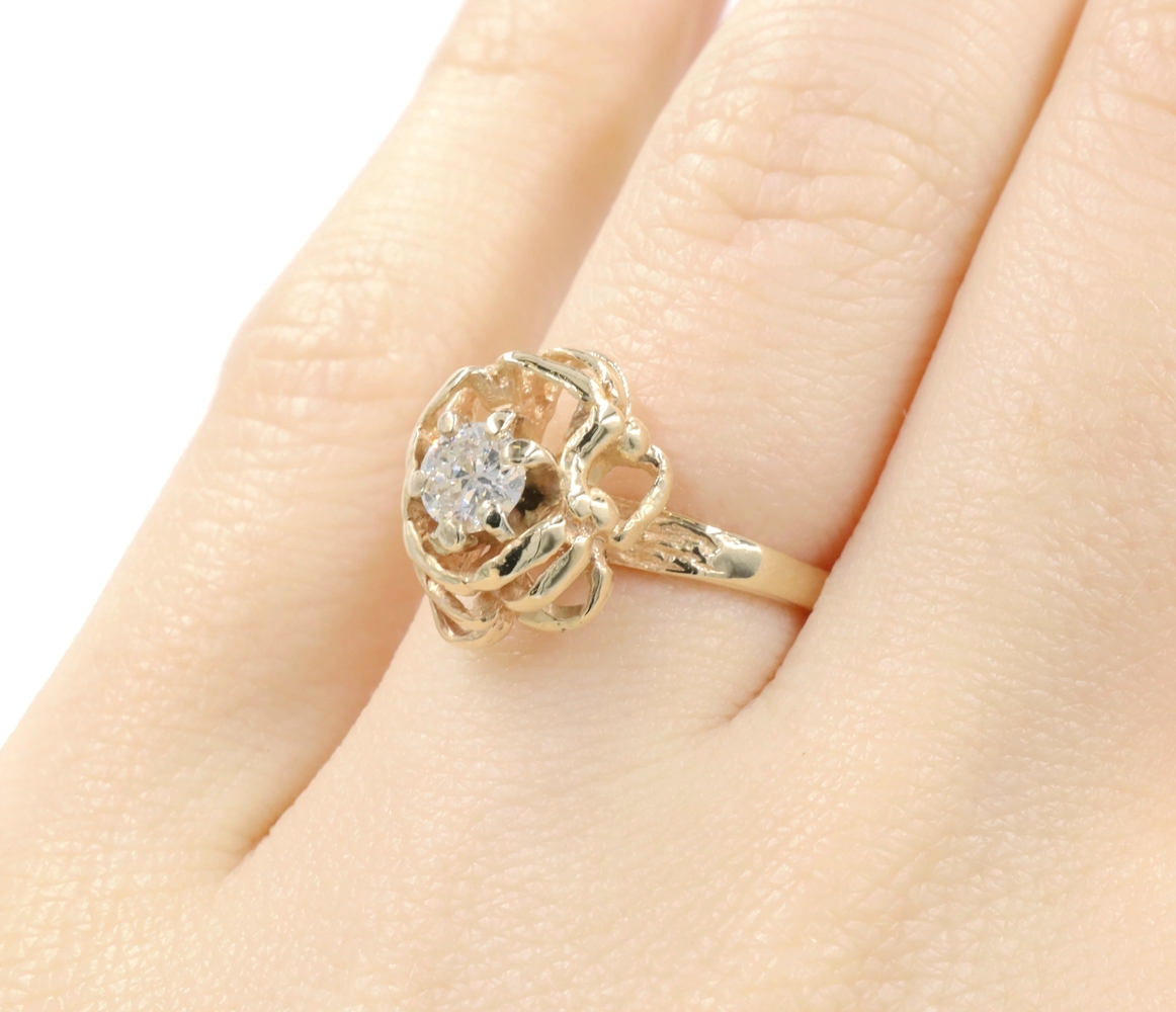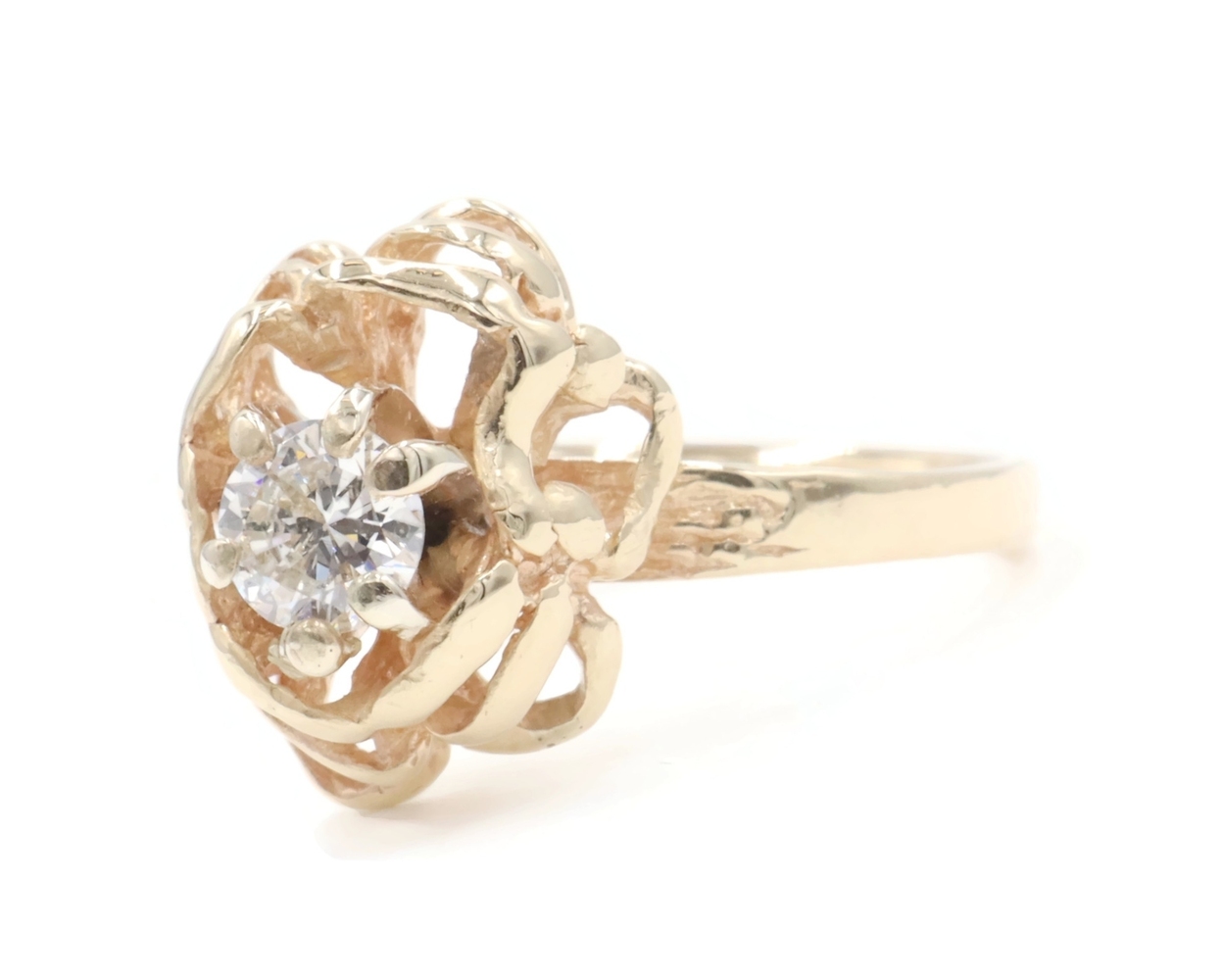 Women's Floral Style 0.35 Ct Solitaire Round Cut Diamond 14KT Yellow Gold Ring. This ring is a size 5 1/4.