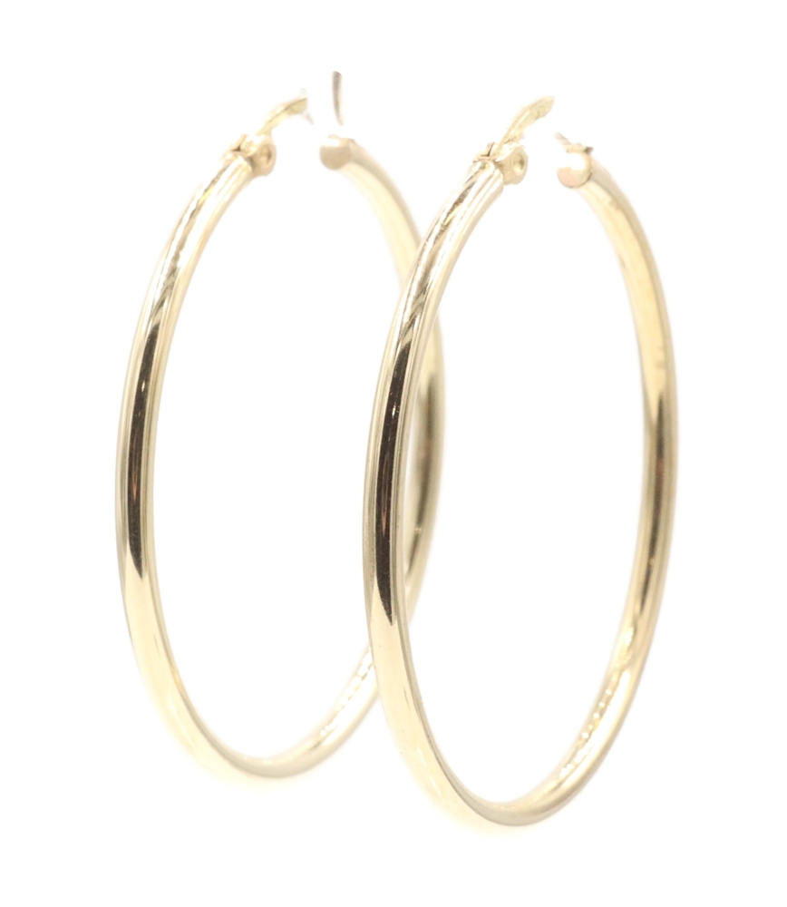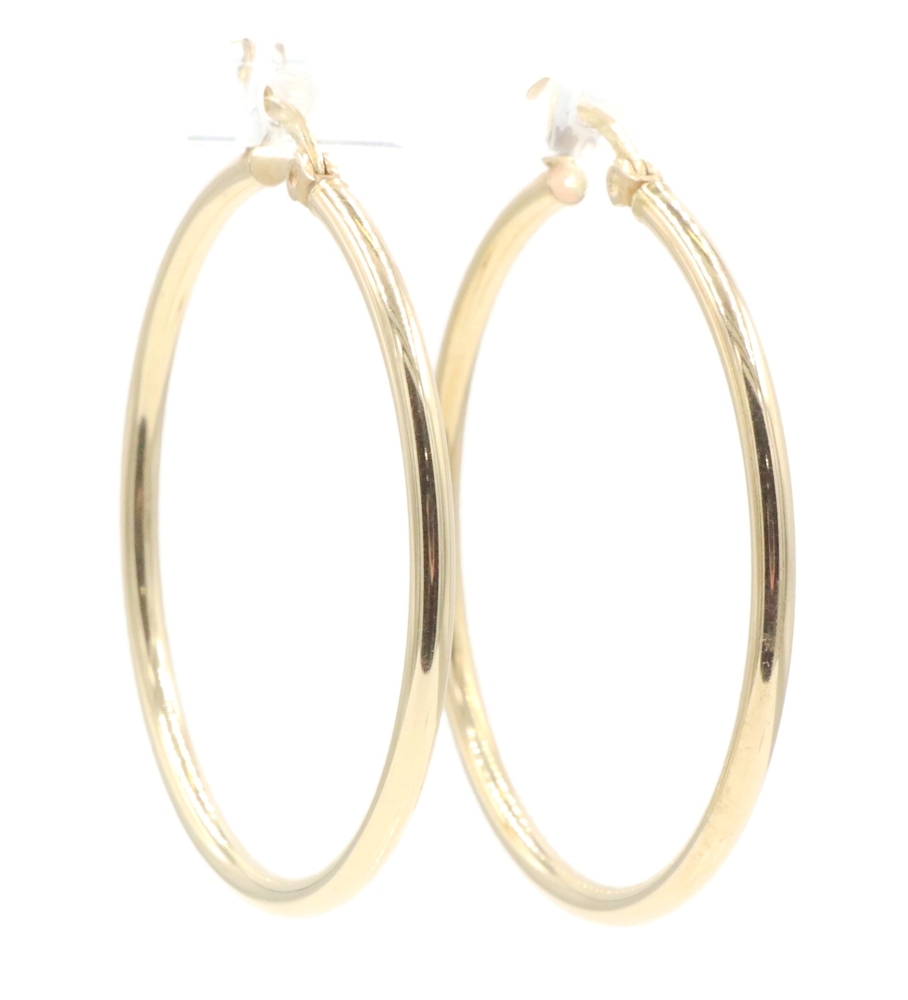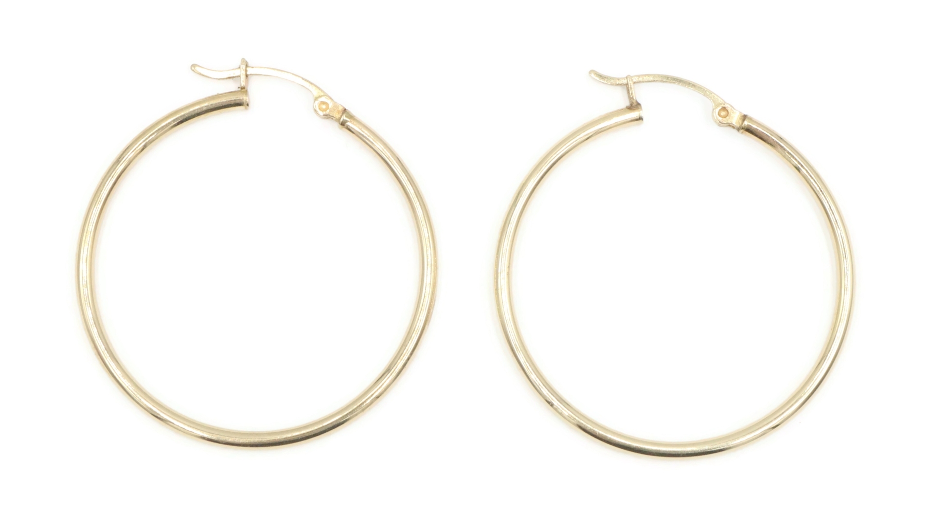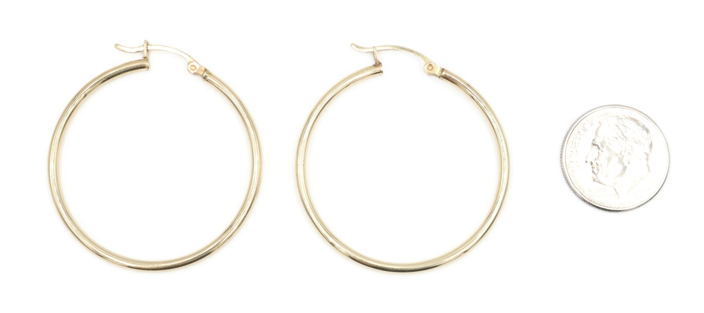 Women's High Shine 10KT Yellow Gold Classic Hollow Hoop 1.3" Earrings - 1.88g. These earrings each have an approximate hoop size of 34mm x 34.7mm.