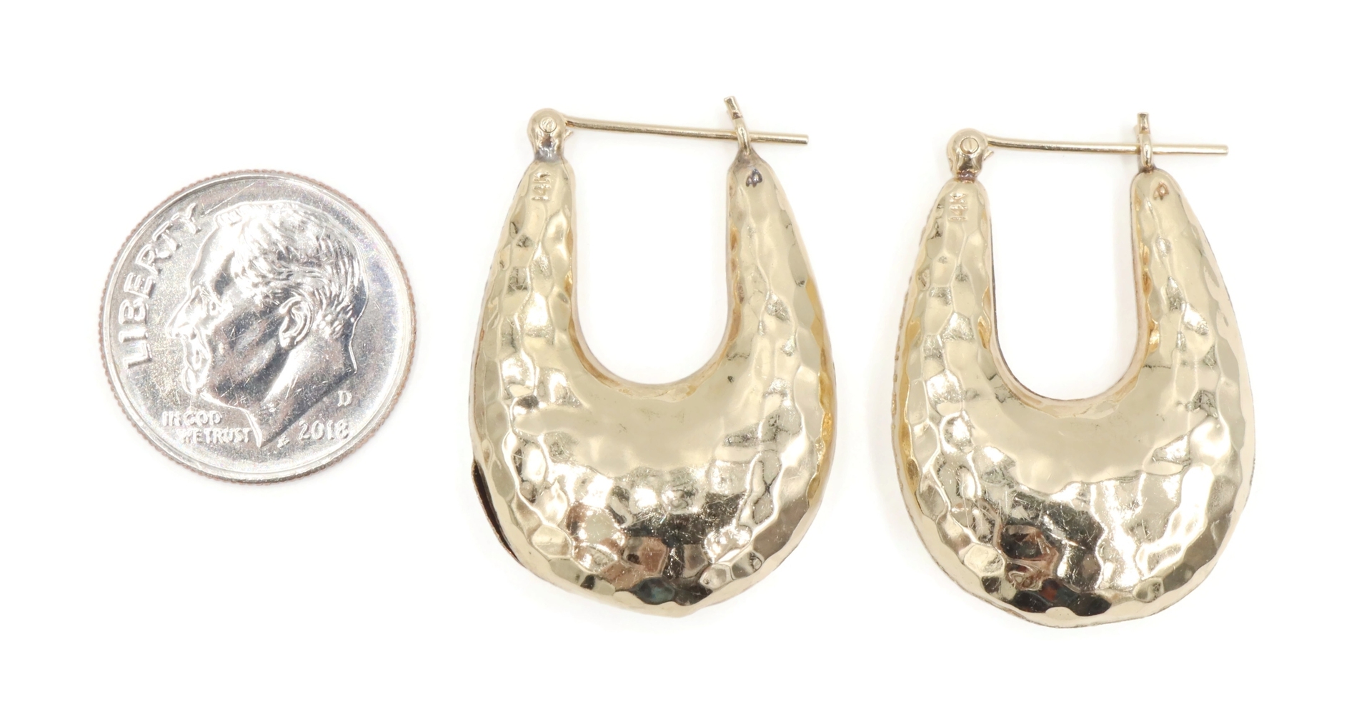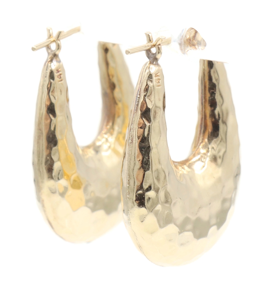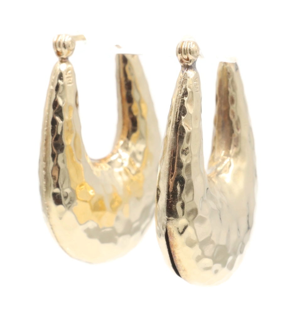 Women's Hollow 14KT Yellow Gold Hammered Texture Oval Hoop Earrings 1.1" - 3.82g. These earrings each have an approximate length of 28.5mm.