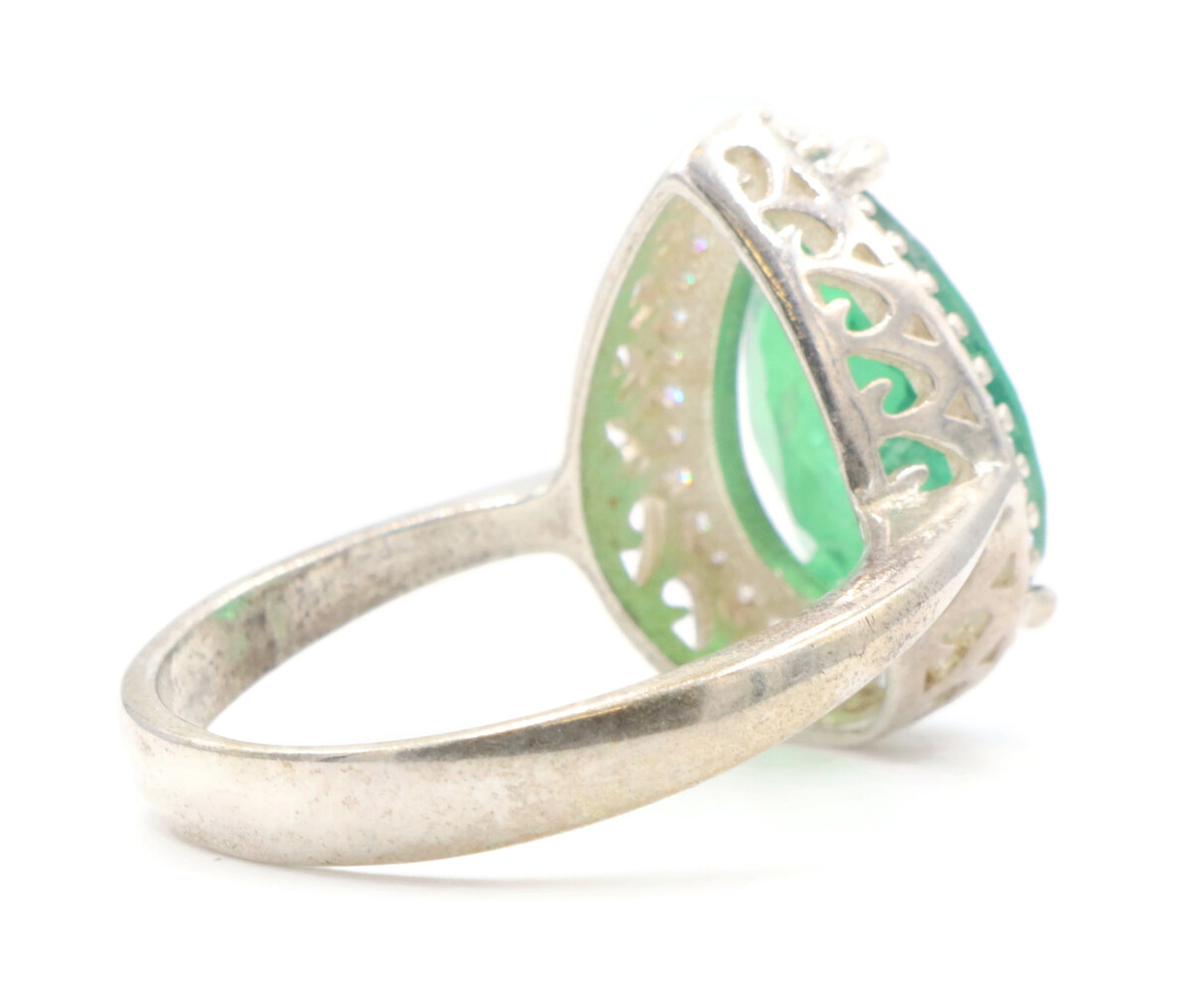 Women's Large Emerald Green Pear Cut CZ with Round CZ Halo Sterling Silver Ring. All stones in this ring are cubic zirconia. This ring is a size 8.5.