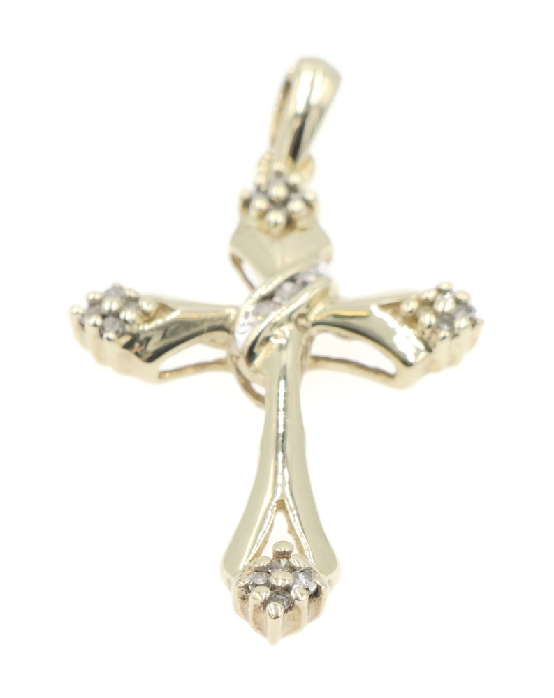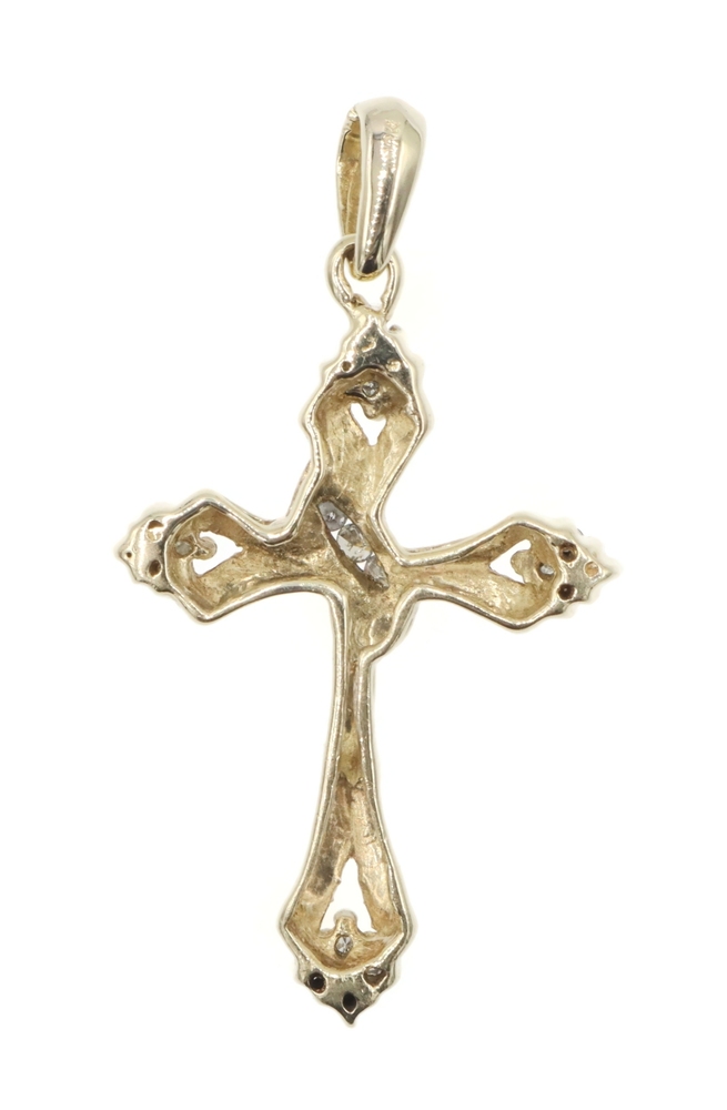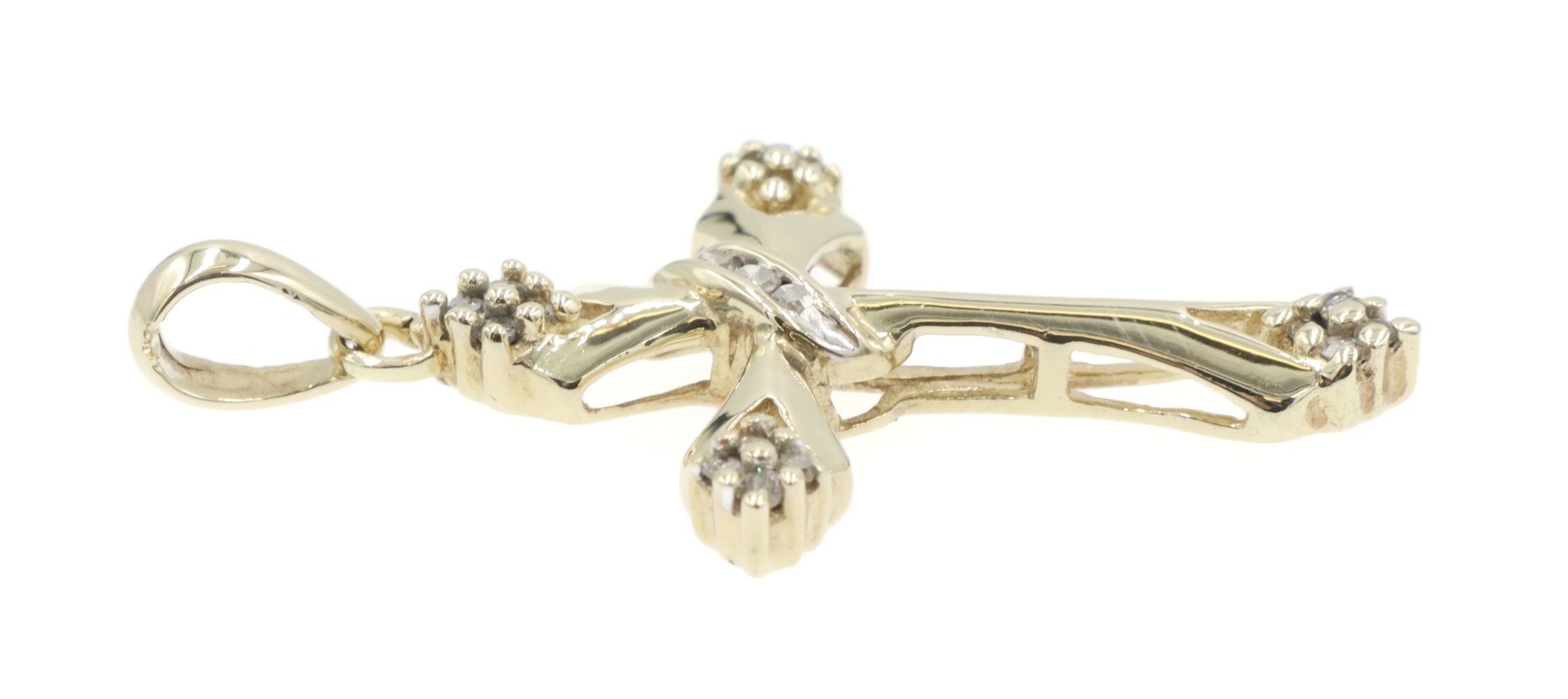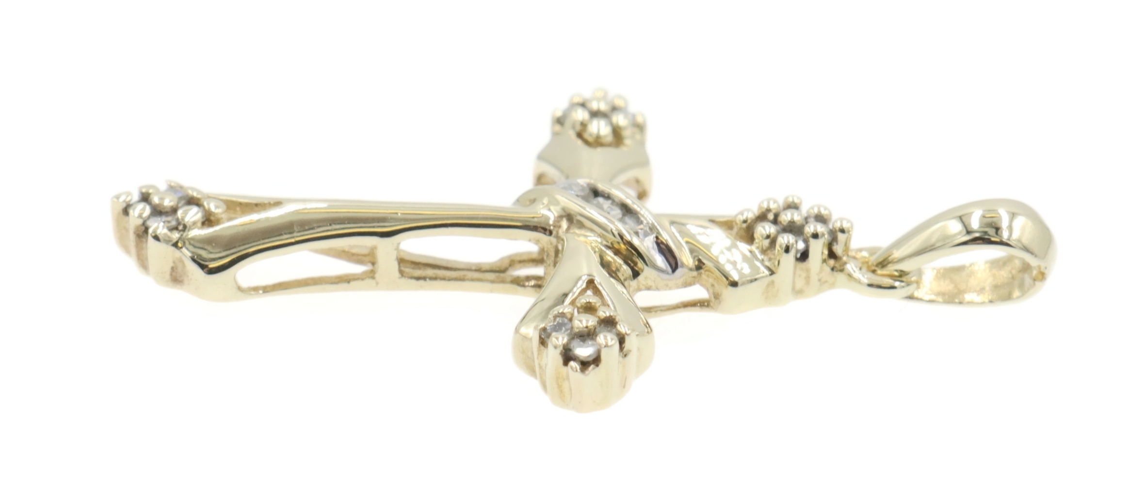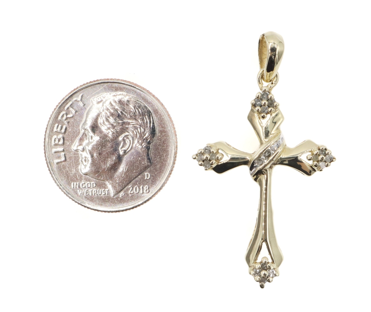 Women's Religious 0.19 Ctw Round Diamond 10KT Yellow Gold Cross Pendant 1.3" 2g. This pendant is approximately 34.2mm in length (including the bail) and 18.5mm in width.
