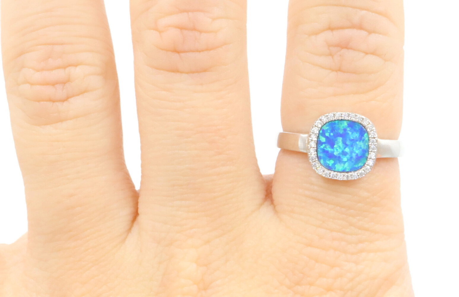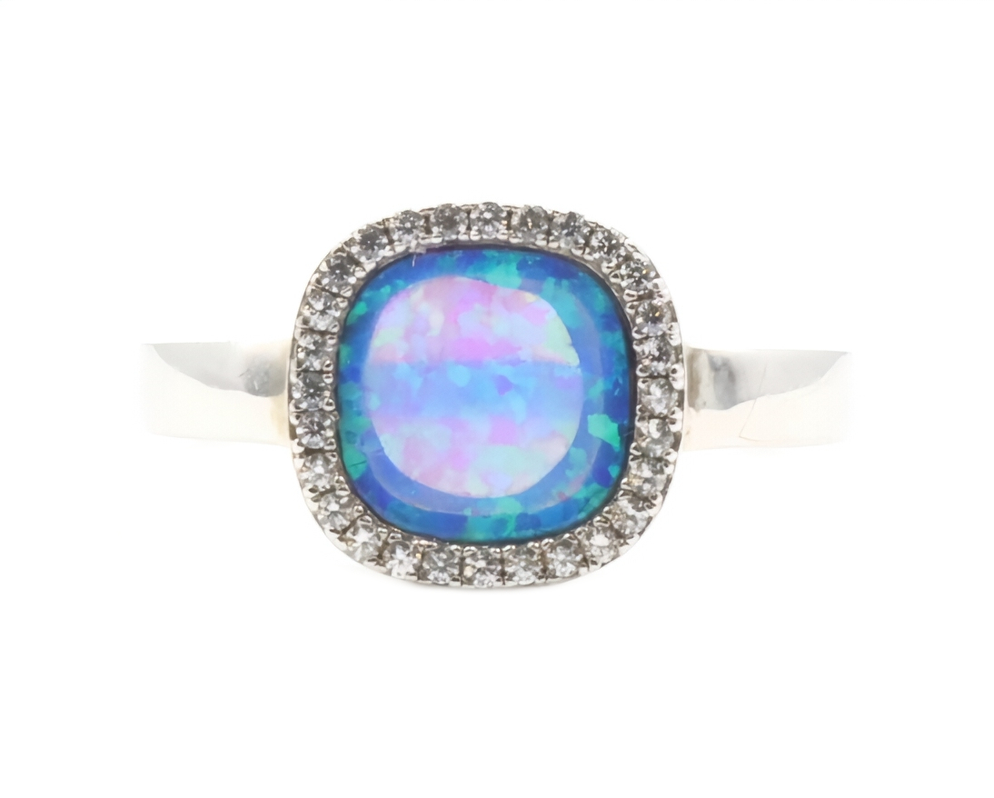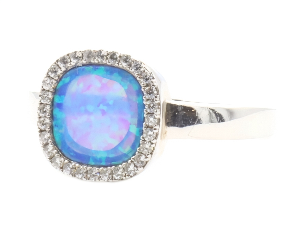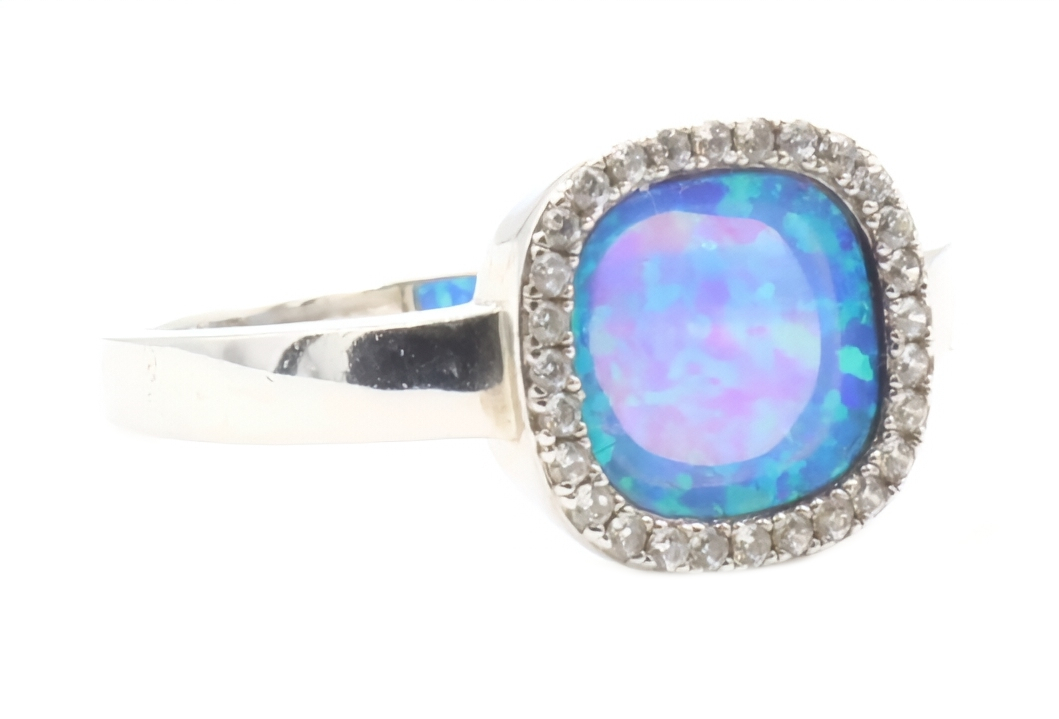 Women's Sterling Silver Blue Synthetic Opal & Round CZ Halo Statement Ring | USA Pawn