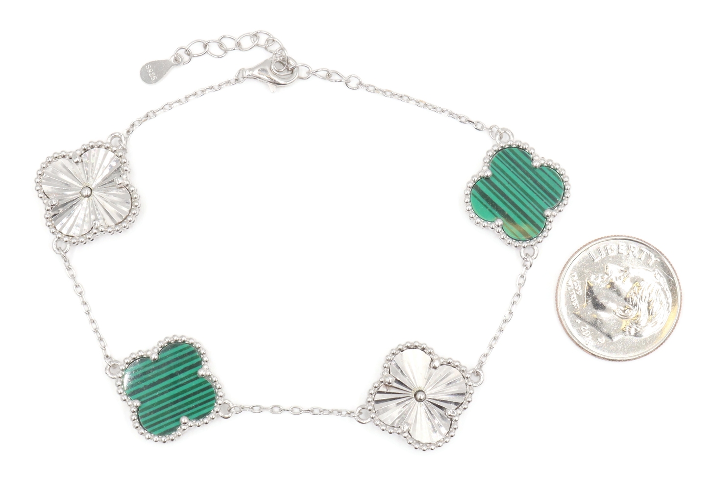 Women's Sterling Silver Clover Cut 15.4mm Faux Malachite 925 Station Bracelet | USA Pawn